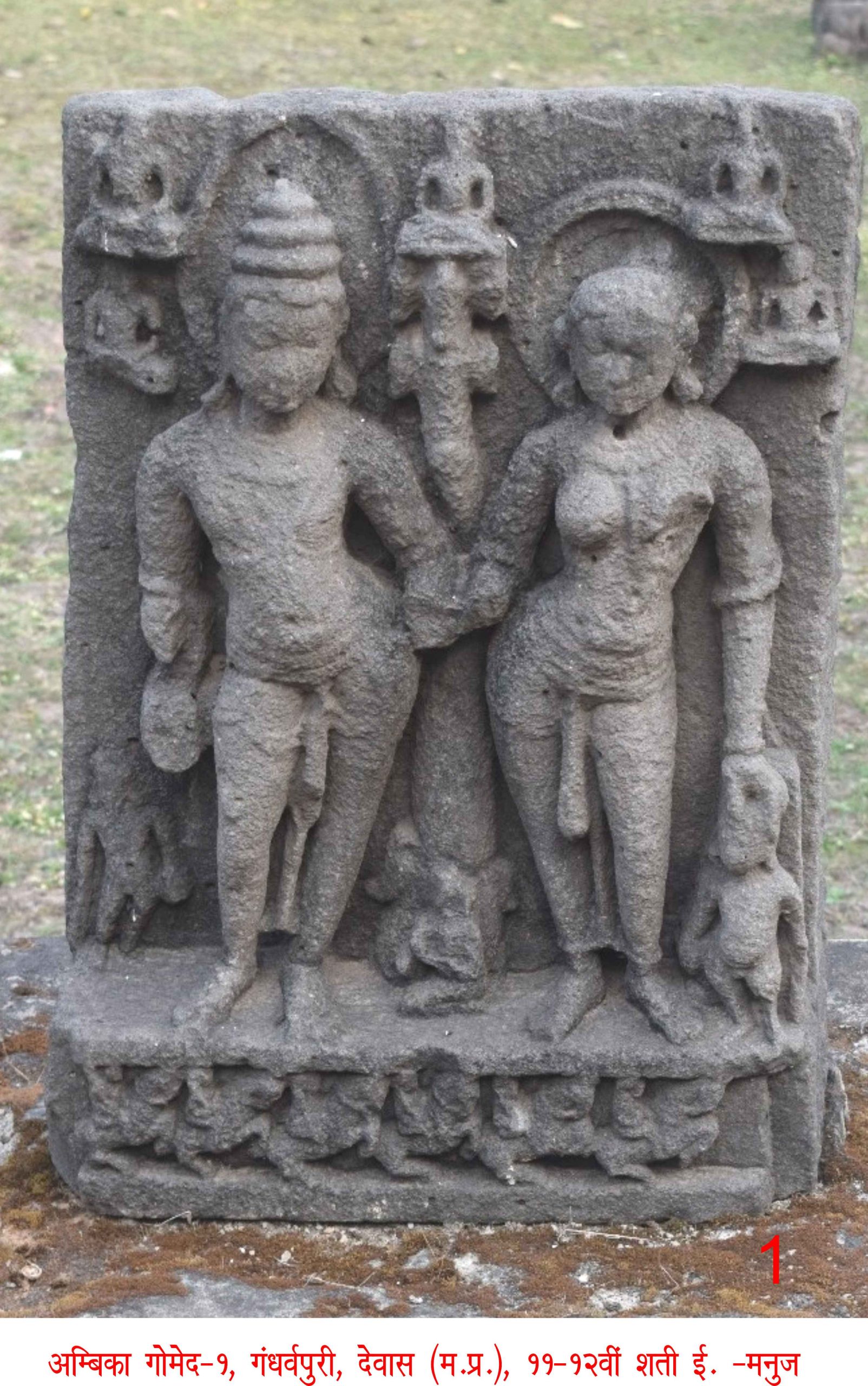 गोमेद-अम्बिका प्रतिमा द्वितीय- इस प्रतिमा में गोमेद-अम्बिका प्रतिमा भी प्रथम प्रतिमा की तरह है। इनके शिर सहित वितान भाग भग्न और अनुपलब्ध है। पुरातत्त्व विभाग की पंजी में इसे किसी अन्य प्रतिमा के नाम से पंजीवद्ध किया गया है, जैन प्रतिमाओं की सूची में इसका उल्लेख नहीं है। इसके पादपीठ में सात अश्वारोही उत्कीर्णित किये गये हैं। मध्योत्कीर्णित सतम्भ के मूल में दो आराधिकाएँ अंजलिबद्ध बैठीं हैं, येे दोनों भी यक्ष की ओर अभिमुख होकर भक्तिरत हैं। यक्ष-यक्षी के निकट वाले हाथों में बीजपूरक फल है। अंबिका यक्षी के बायें पाश्र्व में बालक खड़ा है, उसके शिर पर देवी की हथेली है, शेष भाग टेहुनी तक भग्न है। यक्ष के दक्षिण पाश्र्व में खड़े बड़े बच्चे का हाथ अपने दाहिने हाथ से थामे हुए है। इस बड़े बच्चे का भी पाषाण क्षरित हो जाने से इसमें स्पष्टता नहीं है। इसके कुछ वक्ष उभार से प्रतीत होता है कि यह स्त्रीपात्र है। अलंकरण आदि सभी प्रथम यक्ष-यक्षी प्रतिमा के समान हैं।