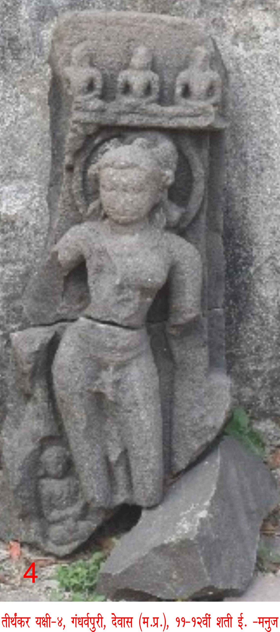 तीर्थंकर-यक्षी प्रतिमा चतुर्थ- इस तीर्थंकर-यक्षी प्रतिमा का परिकर और घुटनों से नीचे का अधोभाग भग्न और अप्राप्त है। इसके चरणों के पास एक आराधिका बैठी हुई अवशिष्ट है। केश-सज्जा प्रथम प्रतिमा की यक्षी के समान है, प्रभावल भी वर्गाकार है। शिर के ऊपरी भाग में एक ही आसन पर समान स्तर पर तीन लघु जिन पद्मासनस्थ हैं।