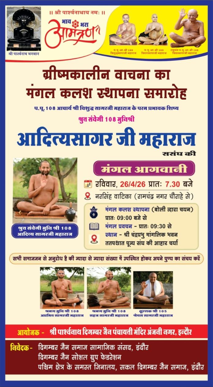 धर्म नगरी इंदौर में 26 अप्रैल रविवार को श्रंमण संस्कृति के महामहिम पट्टाचार्य आचार्य श्री विशुद्ध सागर जी महाराज के कुल गोरव श्रुत संवेगी मुनि श्री आदित्य सागर जी श्रुत प्रिय मुनि अप्रमित सागर जी सहजानंदी मुनि श्री सहज सागर जी एवं छुल्लक श्री श्रेयस सागर जी ससंघ की मंगल आगवानी, एवं ग्रीष्मकालीन वाचना का मंगल कलश स्थापना समारोह*धर्म समाज प्रचारक राजेश जैन दद्दू ने बताया की ग्रीष्मकालीन वाचना के निमित्त *मंगल कलश स्थापना समारोह का आयोजन रविवार, 26 अप्रैल 2026 को होगा।