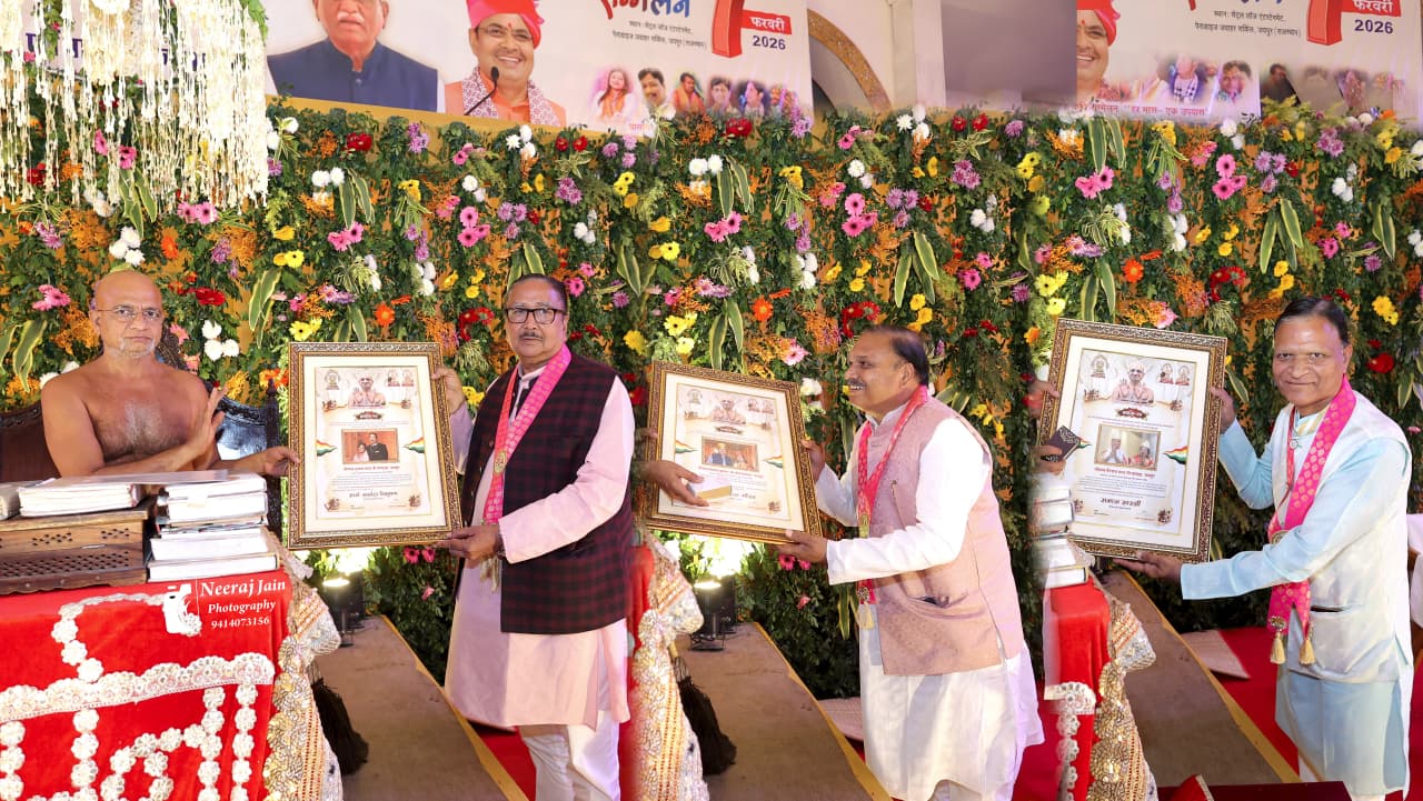 समारोह की अध्यक्षता राज्यपाल हरिभाव किसनराव बागडे ने की। मुख्य मंत्री भजन लाल शर्मा मुख्य अतिथि के रूप में शामिल हुए। उप मुख्यमंत्री डाॅ प्रेम चन्द बैरवा,सांसद मंजू शर्मा, कैबिनेट मंत्री राज्यवर्धन सिंह राठौड विशिष्ट अतिथि के रूप में शामिल हुए। युवा परिषद् के राष्ट्रीय महामंत्री उदयभान जैन जयपुर ने अवगत कराया कि इस मौके पर परम पूज्य संघस्थ प्रवर्तक मुनि श्री सहज सागर जी महाराज ने एक मास एक उपवास कार्यक्रम के अवसर पर उपस्थित धर्म सभा को सम्बोधित करते हुए कहा कि धर्म का मर्म समझो ,अभी धर्म के नाम पर हम अपने को धोखा दे रहे हैं मुनि श्री ने कहा कि खुद स्वाध्याय करो,पढ़ो समझो , विकृतियों को छोड़ो । मानव पर्याय मिला जो अमूल्य है, जैन कुल मिला सब कुशलता है खूब पुण्य बंध करो,एक मास में एक उपवास जरूर जरूर करो अपने स्वास्थ्य के साथ अपने कुल, अपनी आत्मा को शुध्द करो ये ही मंगल आशीर्वाद है। आचार्य प्रसन्न सागर महाराज ने अंतर्मना आचार्य प्रसन्न सागर महाराज जयपुर प्रवास समिति जयपुर के तत्वावधान में आयोजित 7 दिवसीय चारित्र शुद्धि महामण्डल विधान की सफलता के लिए अध्यक्ष सुभाष चन्द जैन, महामंत्री विनोद जैन कोटखावदा एवं कोषाध्यक्ष कैलाश चन्द छाबड़ा को प्रशस्ति पत्र देकर सम्मानित किया। इस अवसर पर अन्तर्मना आचार्य श्री प्रसन्न सागर जी महाराज ने अपने अन्तर्मन से अनन्त आशीर्वाद प्रदान करते हुए हर मास एक उपवास कार्यक्रम के सफलता के अन्तर्गत *गुरु भक्त कैलाश छाबडा महारानी फार्म , जयपुर को समाज सारथी की उपाधि से सम्मानित किया गया।