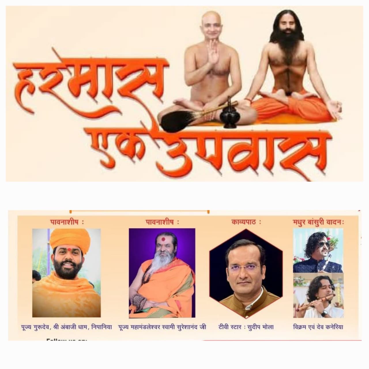 पतंजलि योगपीठ हरिद्वार एवं अंतर्मना धार्मिक एवं पारमार्थिक न्यास तत्वाधान में आयोजित साधना महोदधि अंतर्मना आचार्य श्री 108 प्रसन्न सागरजी महाराज के पावन सानिध्य में ‘हर मास एक उपवास’ के चतुर्थ सामूहिक उपवास कार्यक्रम का आयोजन नीमच म.प्र.होने जा रहा है। उक्त आयोजन के तहद दिगम्बर जैन संत अंतर्मना आचार्य श्री द्वारा समाज के प्रत्येक वर्ग को उपवास के महत्व व उससे होने वाले लाभ का महत्व समझाया जाता है। यथा शक्ति महीने में एक माह उपवास का संकल्प दिलवाया जाता है।
