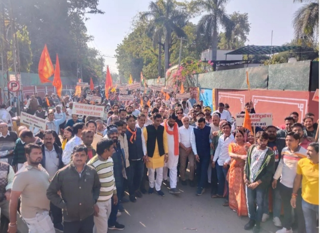 भीलवाड़ा, 5 दिसंबर- हिंदुओं पर बांग्लादेश में हो रहे अत्याचार के विरोध में गुरुवार को भीलवाड़ा के बाजार प्रातः 11:00 बजे तक बंद रहेl सर्व हिंदू समाज का शहिद चौक सांगानेरी गेट से आक्रोश रैली निकाली गई l जो कलेक्ट कार्यालय पहुंची l यहां राष्ट्रपति के नाम ज्ञापन सोपा गयाl ज्ञापन में बांग्लादेश में हिंदुओं की सुरक्षा के कदम उठाने की मांग की गईl इस दौरान बजरंग दल के गणेश प्रजापत, विश्व हिंदू परिषद के ओम बलिया, बनवारी शरण काठिया बाबा, संघ चालक चांदमल सोमानी. शंकर लाल माली प्रांत कार्यवाहक, बजरंग दल के गणेश प्रजापत, ओम प्रकाश, महां मंडलेश्वर परमहंस विधायक, अशोक कोठारी, उदयलाल भडाणl ,महापौर राकेश पाठक, भाजपा जिला अध्यक्ष प्रशांत मेवाड़ा, पूर्व मंत्री भवानी जोशी आदि ने कहा कि बांग्लादेश में अल्पसंख्यकों की संपत्ति लूटी जा रही है, हत्याये की जा रही है l जगह-जगह हिंदुओं के घर, दुकानों, धार्मिक स्थलों पर आगजनी की जा रही है l वहां की सरकार इन हमलों को रोकने में असफल साबित हो रही हैl अगर कार्रवाई नहीं हुई तो अब हिंदू समाज बांग्लादेश सीमा पर जमा होगा l