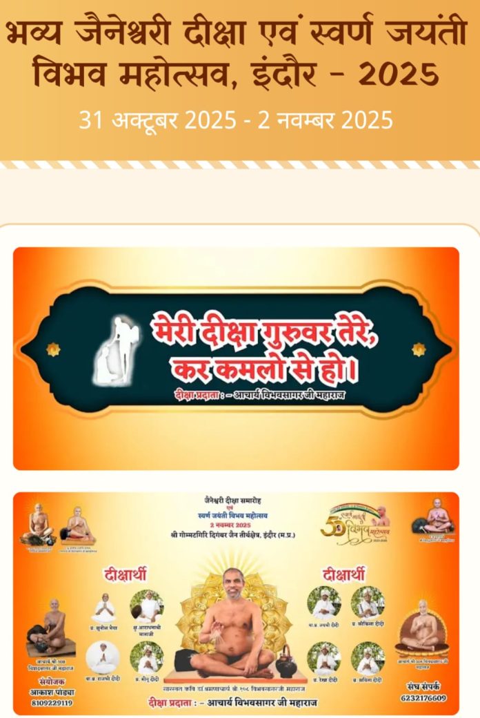 मां अहिल्या की पावन नगरी की पुण्यभूमि गोम्मटगिरि तीर्थक्षेत्र पर प्रथम बार इतिहास रचने जा रहा है भव्य 9/ नव भव्य जैनेश्वरी दीक्षा गणाचार्य विराग सागर जी एवं वर्तमान श्रमण संस्कृति के महामहिम पट्टाचार्य आचार्य श्री विशुद्ध सागर जी महाराज के मंगलमय आशीर्वाद से आचार्य विभव सागर स्वर्णिम जयंती महामहोत्सव । धर्म समाज प्रचारक राजेश जैन दद्दू ने बताया कि आगामी दिनांक : 31 अक्टूबर शुक्रवार से 2 नवम्बर रविवार 2025 भव्य