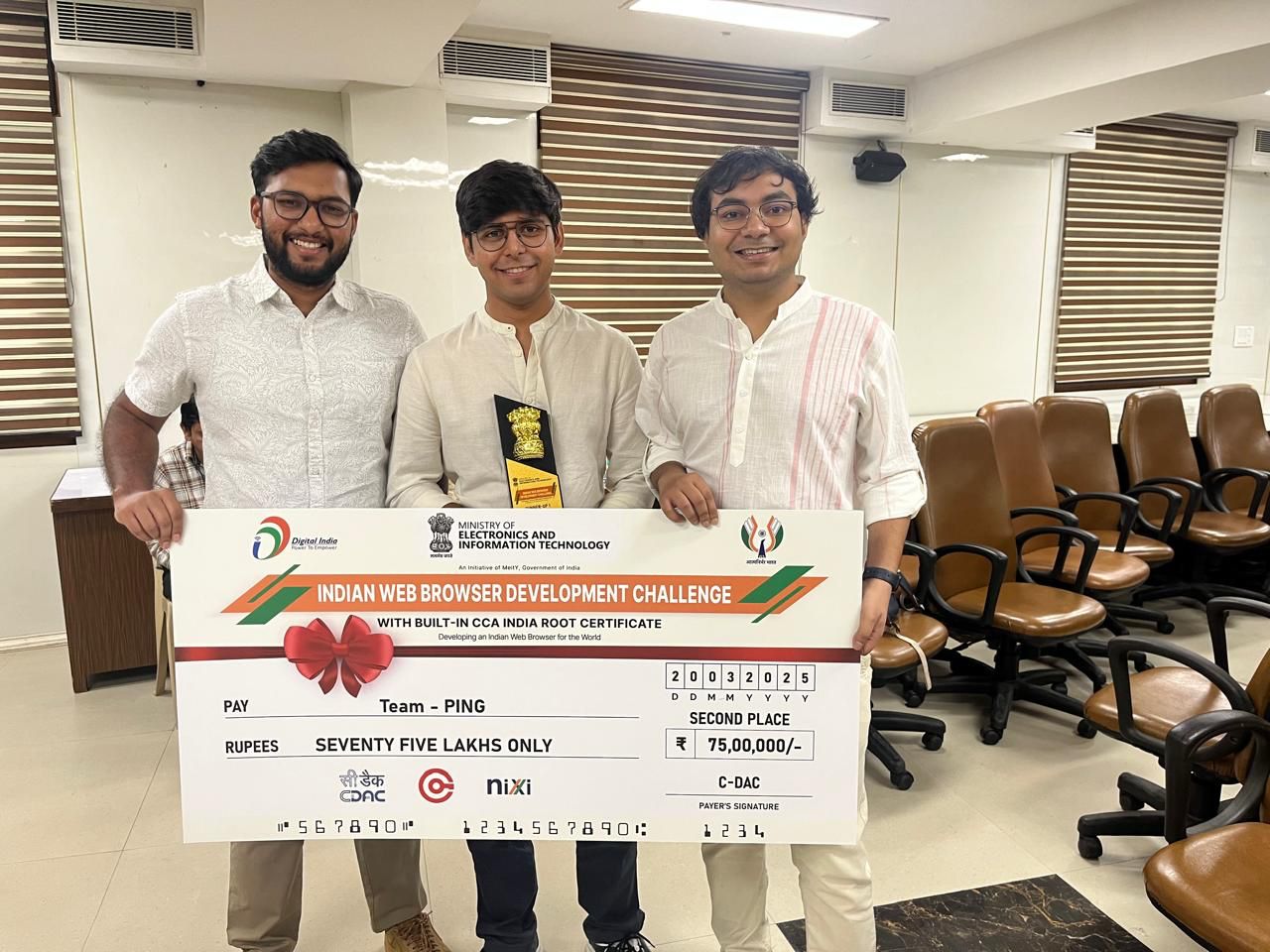 की टीम पींग को जिसमें भव्य काला के साथ शुभम् कुमार सिंगरोली व उदय बंसल दिल्ली थे को एक भव्य कार्यक्रम में केन्द्रीय केबिनेट मंत्री श्री अश्विनी वैष्णव द्वारा पचहत्तर लाख का द्वितीय पुरस्कार चेक भारत सरकार की और से प्रदान किया गया