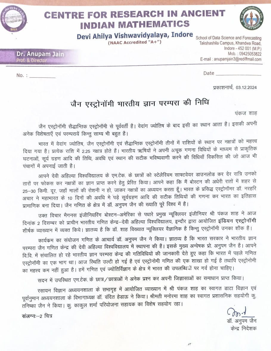 उक्त विचार मैगनस इंजीनियरिंग बोस्टन-अमेरिका से पधारे प्रमुख न्यूक्लियर इंजीनियर श्री पंकज शाह ने आज दिनांक 2 दिसम्बर को प्राचीन भारतीय गणित केन्द्र-देवी अहिल्या विश्वविद्यालय, इन्दौर द्वारा आयोजित इंडियन एस्ट्रोनॉमी शीर्षक व्याख्यान में व्यक्त किये। ज्ञातव्य है कि डॉ. शाह विख्यात न्यूक्लियर वैज्ञानिक है किन्तु एस्ट्रोनॉमी उनका शौक है।