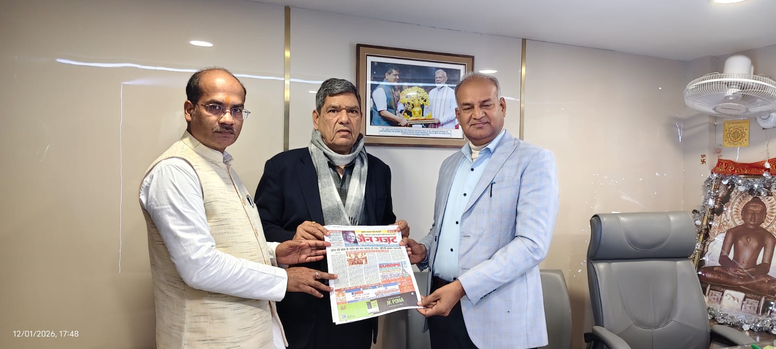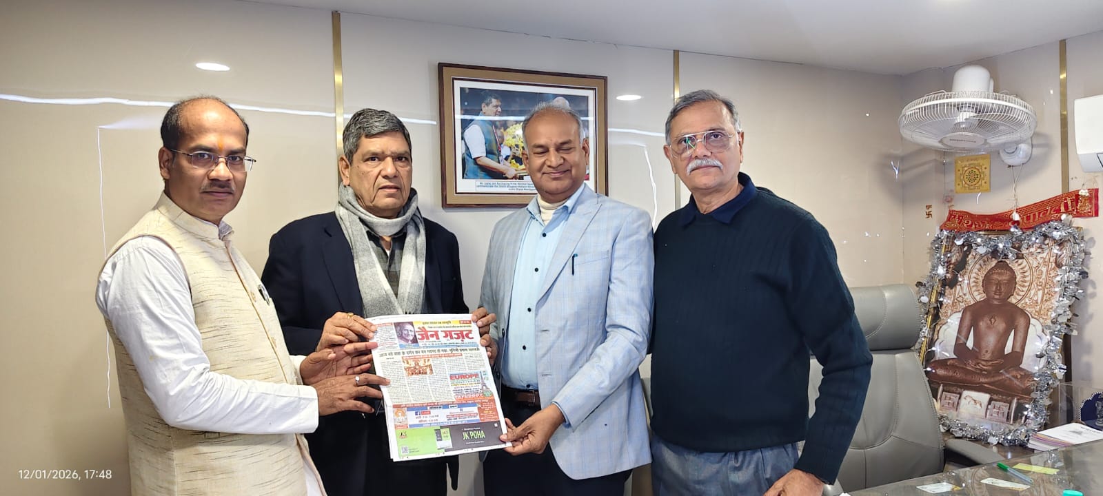 दिल्ली। अखिल भारतवर्षीय दिगम्बर जैन महासभा के दिल्ली स्थित कार्यालय में 12 जनवरी 2026 को महासभा के राष्ट्रीय अध्यक्ष श्रेष्ठी श्री गजराज जी गंगवाल से महासभा के प्रमुख साप्ताहिक पत्र ‘जैन गजट’ के सह-संपादक द्वय डॉ. सुनील संचय (ललितपुर) एवं श्री राजेन्द्र महावीर (सनावद) ने शिष्टाचार भेंट की।