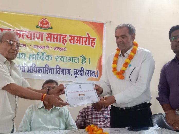 राष्ट्रीय मीडिया प्रभारी पारस जैन पार्श्वमणि पत्रकार ने बताया कि राणा प्रताप मीरा पन्ना धाय के तप त्याग ओर साधना की पावन वसुंधरा राजस्थान प्रांत की हाड़ी रानी की कर्म भूमि छोटी काशी के नाम से सुविख्यात धर्म प्राण नगरी बूंदी में दिनांक 0 1 अक्टूबर कोअन्तर्राष्ट्रीय वृद्धजन दिवस पर सामाजिक न्याय एवं अधिकारिता विभाग द्वारा सुदामा सेवा संस्थान में आयोजित समारोह में जैन गजट संवाददाता एवं कर सलाहकार व खण्डेलवाल सरावगी समाज के पूर्व अध्यक्ष रविन्द्र काला को कार्यक्रम के मुख्य अतिथि बूंदी विधायक व पूर्व मंत्री हरिमोहन शर्मा ने प्रशस्ति पत्र देकर सम्मानित किया।