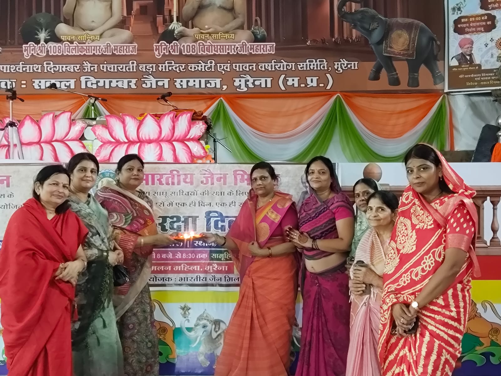 श्री चंद्रप्रभु दिगम्बर जैन पल्लीवाल मंदिर लोहिया बाजार में जैन मिलन महिला राजुल, जैन मिलन बालिका एवं जैन मिलन मुरैना के संयुक्त तत्वावधान में जैन तीर्थों, मंदिरों, साधु संतों की रक्षार्थ “रक्षा दिवस” पर सामूहिक महामंत्र णमोकार मंत्र का पाठ एवं सामूहिक महाआरती का आयोजन किया गया । उपस्थित सभी साधर्मी बंधुओं, माता बहिनों एवं युवा साथियों ने संगीत की मधुर धुन पर पंच परमेष्ठि का गुणगान कर जैन तीर्थों, मंदिरों एवं साधु संतों की रक्षा का संकल्प लिया ।