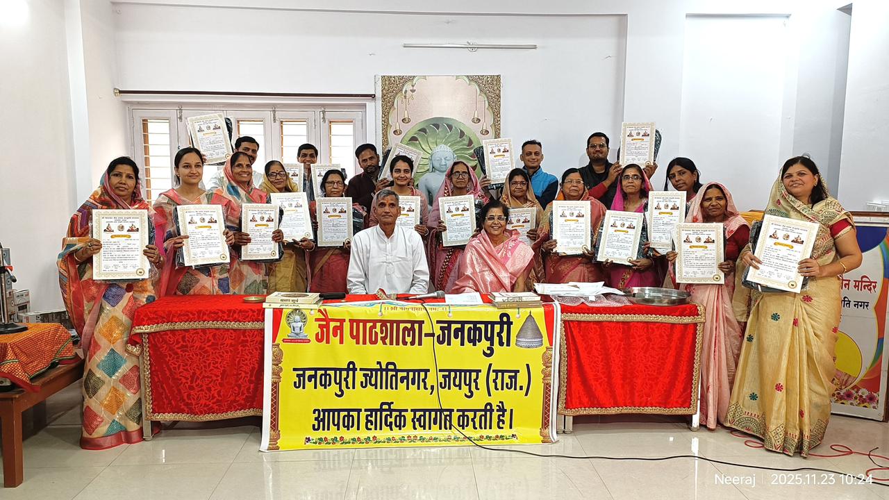 जयपुर – 23/11/25 जयपुर शहर में जैन पाठशाला जनकपुरी जयपुर का तृतीय वार्षिक उत्सव रविवार को उत्साह पूर्वक संयम भवन जनकपुरी जैन मंदिर में मनाया गया , कार्यक्रम में पाठशाला के मार्गदर्शक शिखर चंद जैन ने समाज में पाठशाला की उपयोगिता व महत्व को समझाया साथ ही स्वाध्याय की आवश्यकता को बताया पाठशाला के मुख्य संयोजक पदम जैन बिलाला ने बताया कि संस्कारों की जनक पाठशाला, श्रमण संस्कृति संस्थान सांगानेर के पाठशाला एवं द्वादश वर्षीय पाठ्यक्रम को वर्ष 2022 से संचालित कर रही है ।जिसमे वर्तमान में 156 विद्यार्थी पंजीकृत है ।इससे पूर्व बच्चों द्वारा मंगलाष्टक व मंगलाचरण , जे के जैन लाड देवी व रमेश राज चौधरी द्वारा दीप प्रज्वलन , किरण शिखर चंद जैन द्वारा मंगल कलश स्थापन एवं सोभाग पाटनी परिवार बँथली द्वारा जिनवाणी स्थापित की गई ।