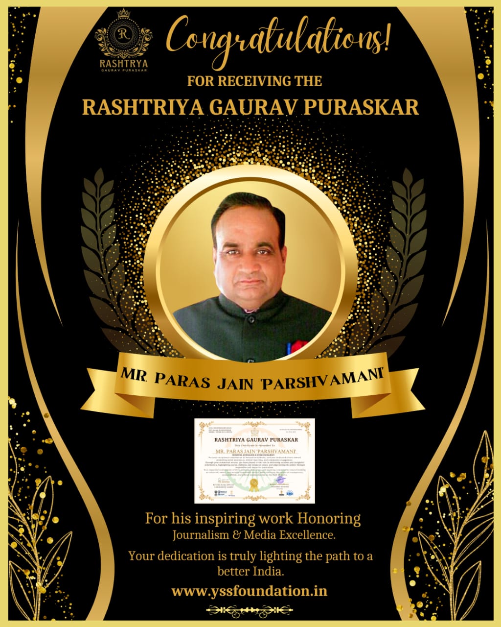 पारस जैन ‘पार्श्वमणि’ ने जैन समाज की धार्मिक, सामाजिक एवं सांस्कृतिक गतिविधियों को पत्रकारिता के माध्यम से जन-जन तक पहुंचाने में महत्वपूर्ण भूमिका निभाई। उनकी लेखनी ने केवल समाज को जागरूक किया, बल्कि सामाजिक एकता, धार्मिक मूल्यों और मानवीय संवेदाओं को भी संशक्त रूप से प्रेरित किया। उनकी उत्कृष्ट सेवाओं को देखते हुए वर्तमान राज्य सरकार के मुख्यमंत्री श्री भजनलाल शर्मा द्वारा उन्हें मुख्यमंत्री आवास पर ‘वर्तमान का श्रमण कुमार’ की उपाधि से अलंकृत किया गया था। वे उनके सेवा-भाव, संयम और समाज के प्रति निष्ठा की प्रशंसा करते हैं। अब उन्हें प्रथम प्रयास से 700 से अधिक सामाजिक, धार्मिक एवं विभिन्न प्रतिष्ठित मंचों पर सम्मानित एवं अभिनंदित किया जा चुका है। उन्हें ‘जैन युवा पत्रकार गौरव’, ‘सर्वश्रेष्ठ संवाददाता अवार्ड’ तथा जैन समाज के ‘अनमोल मणि’ जैसी प्रतिष्ठित उपाधियों से भी नवाजा जा चुका है। चयन समिति के अनुसार, जैन पत्रकारिता के माध्यम से समाज को दिशा देने, धार्मिक चेतना को सुदृढ़ करने और सामाजिक मूल्यों के संरक्षण में उनके दीर्घकालिक योगदान को देखते हुए उन्हें ‘राष्ट्रीय गौरव पुरस्कार 2026’ के लिए सर्वसम्मति से चयनित किया गया है।
