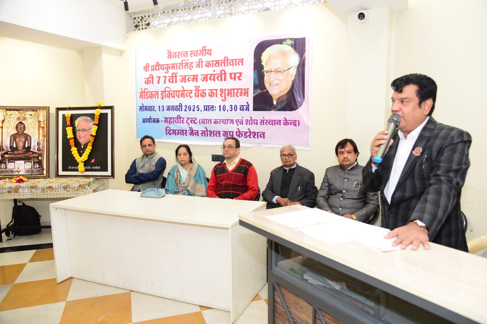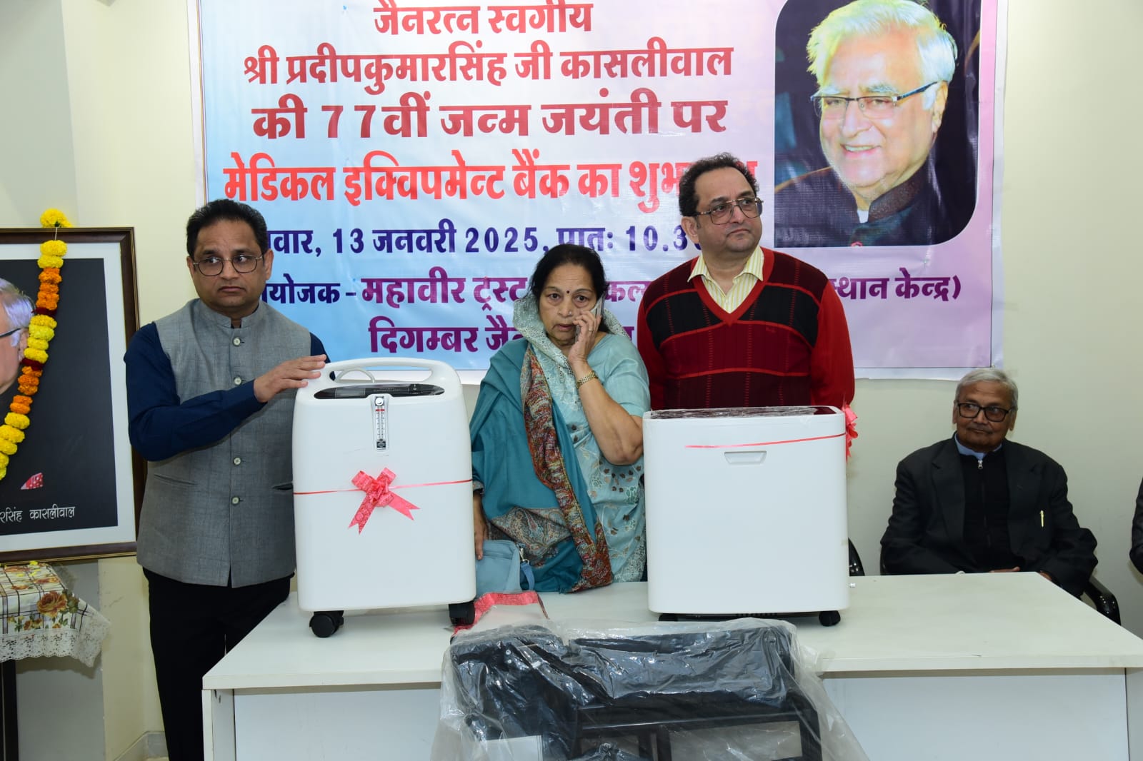 इस अवसर पर महावीर ट्रस्ट के अध्यक्ष अमित कासलीवाल ने बताया महावीर ट्रस्ट द्वारा बाल कल्याण एवं मानव सेवा के कार्यों को निरंतर जारी रखा है जिसमें आज मेडिकल इक्विपमेंट बैंक योजना चालू कर रहे हैं जिसके लिए समाज जनों को रिकवरी बेड, स्लाइन स्टैंड, पल्स ऑक्सीमीटर, ऑक्सीजन कंसंट्रेटर, ऑक्सीजन किट, बैसाखी, व्हीलचेयर, मेडिकल दवाई टेबल, इलेक्ट्रिक साइकिल आदि की सुविधा नाम मात्र शुल्क पर महावीर ट्रस्ट रीगल चौराहा कार्यालय से उपलब्ध कराएंगे । ट्रस्ट द्वारा बहुत से इक्विपमेंट मंगवा लिए गए हैं और भी बहुत से बाकी है जिसे आप समाजजन जो आपके यहां पर सेवा में नहीं आ रहे हो या अपने परिवार जनों की स्मृति में देना चाहते हो वह भी यहां पर देकर पुण्य लाभ प्राप्त कर सकते हैं ।