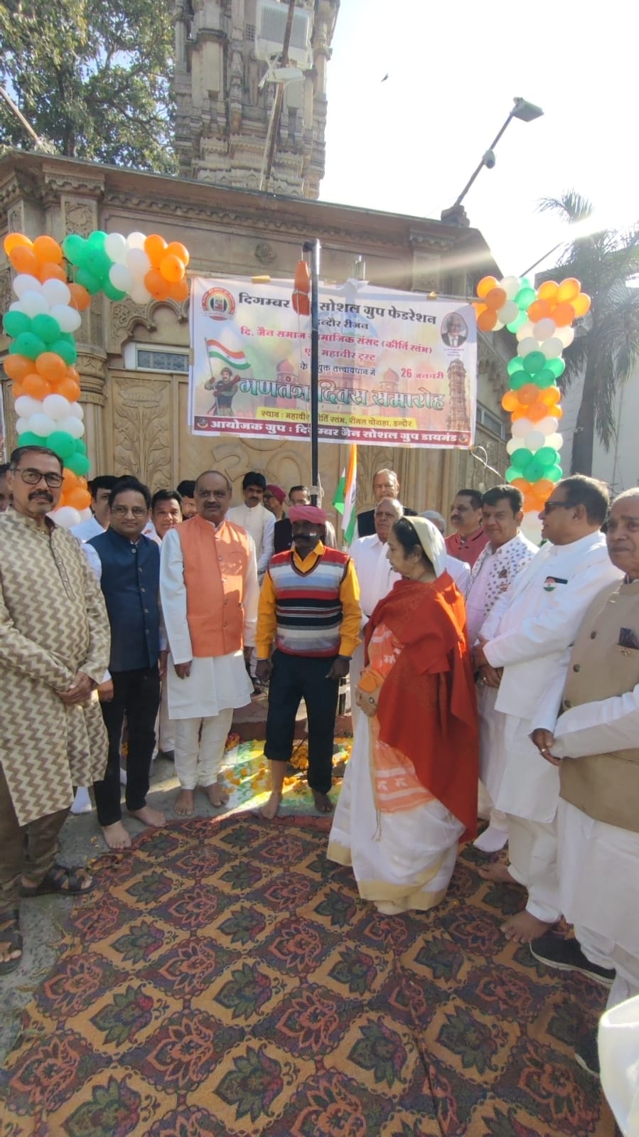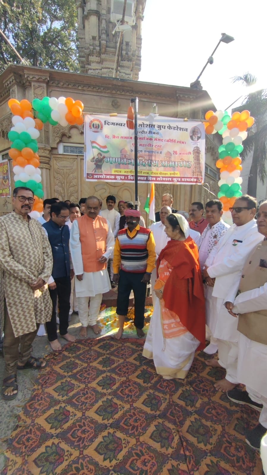 महावीर कीर्ति स्तंभ रीगल चौराहा पर 76 वां गणतंत्र दिवस दिगंबर जैन समाज इंदौर, महावीर ट्रस्ट एवं दिगंबर जैन सोशल ग्रुप फेडरेशन के संयुक्त तत्वाधान में मानव सेवा के प्रकल्प के साथ गणतंत्र दिवस मनाया आज एक दिव्यांग संजीव राय को क्रतिम पेर देकर मानव सेवा के साथ राष्ट्रीय ध्वज फहराया। फेडरेशन के राष्ट्रीय मिडिया प्रभारी राजेश जैन दद्दू ने बताया कि अतिथि जैन समाज की शिरोमणि संरक्षिका श्रीमती पुष्पा कासलीवाल, फेडरेशन के राष्ट्रीय अध्यक्ष राकेश विनायका, आर के जैन रानेका, महावीर ट्रस्ट के अध्यक्ष अमित कासलीवाल, महामंत्री बाहुबली पांड्या, सामाजिक संसद के अध्यक्ष राजकुमार पाटोदी द्वारा कृत्रिम पैर देकर मनाया गया ।