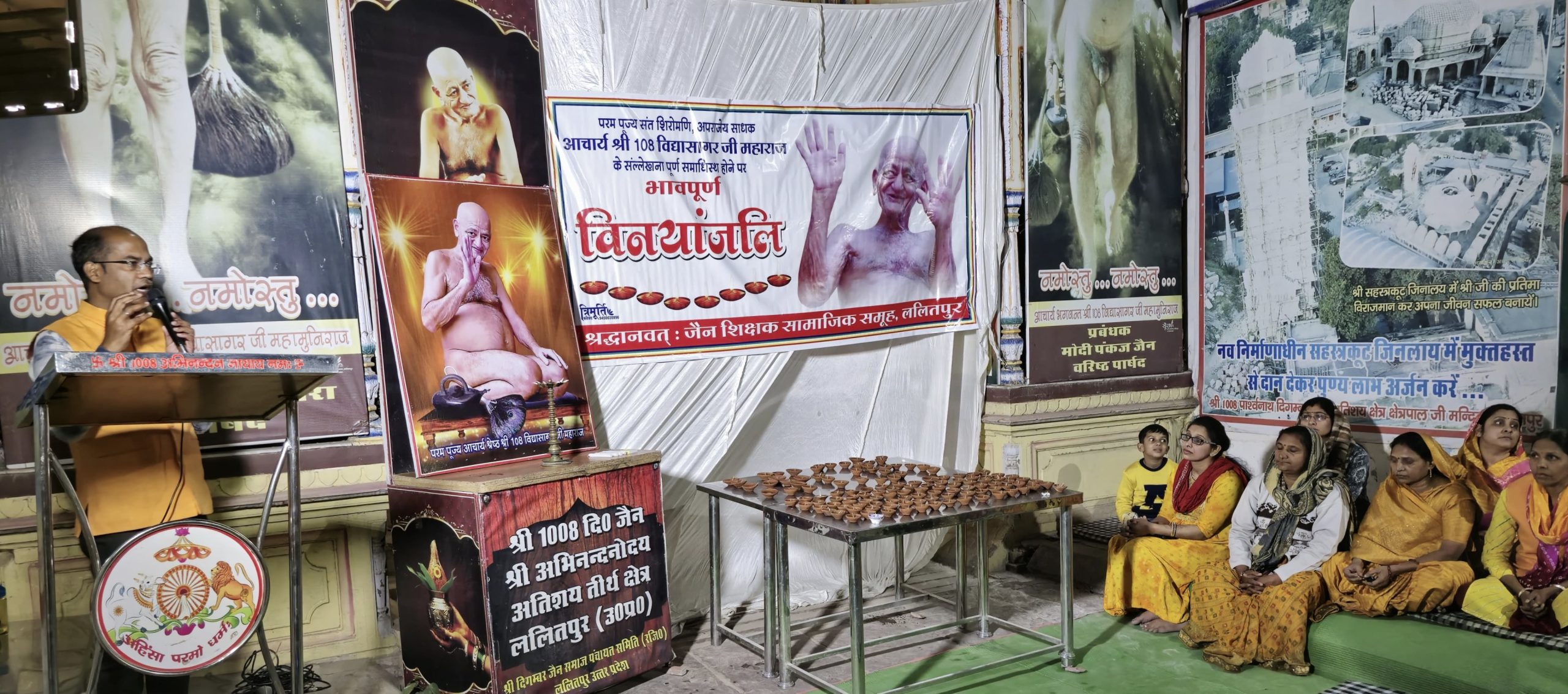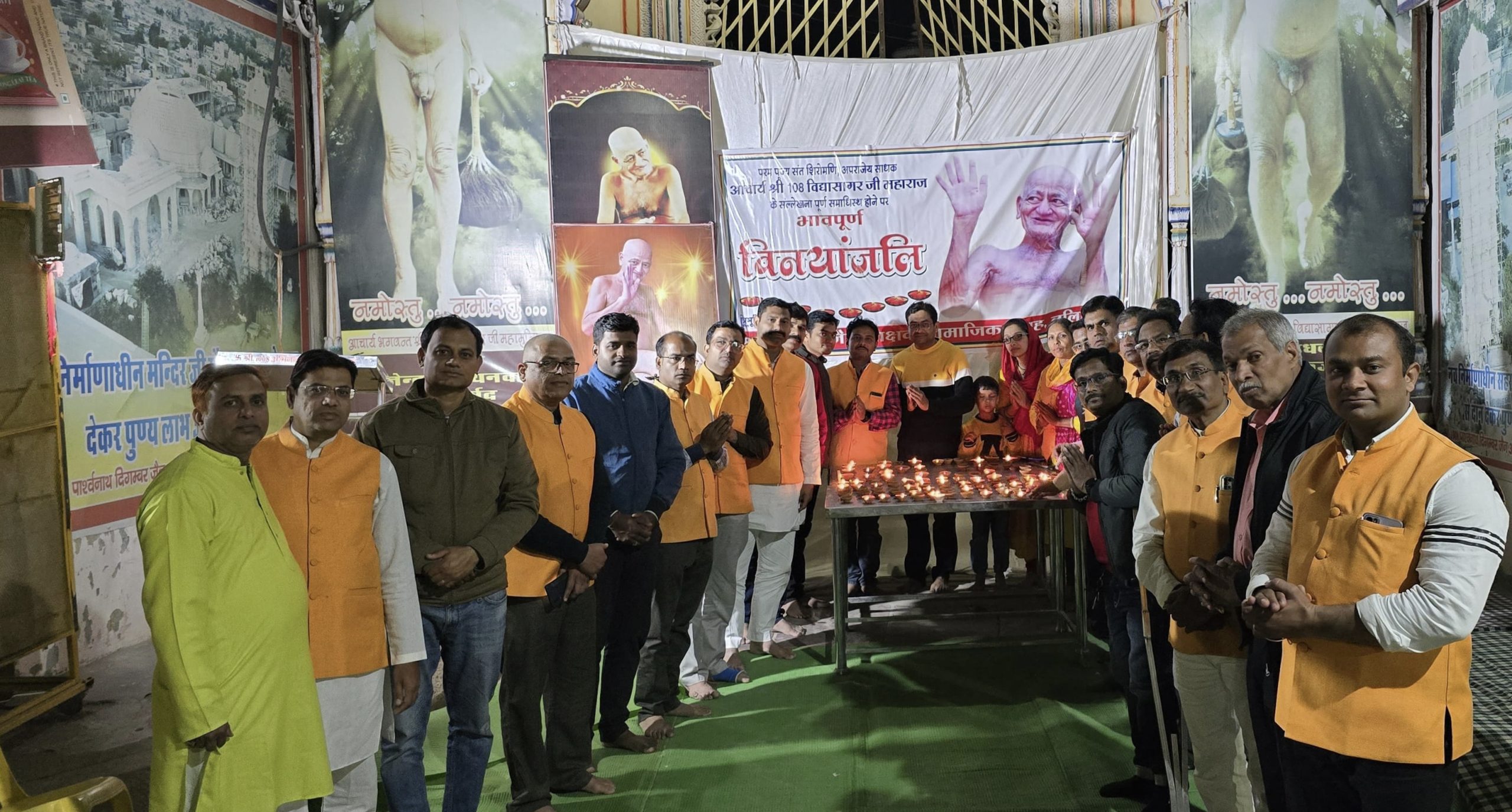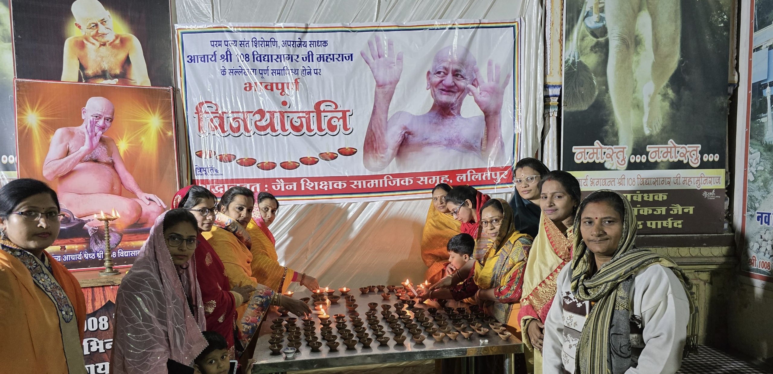 संरक्षक देवेंद्र जैन,अजय जैन पत्रकार,संयोजक अंतिम जैन ने संयुक्त रूप से आचार्य श्री विद्यासागर महाराज के चित्र के समक्ष दीप प्रज्जवलित कर किया। तत्पश्चात जैन शिक्षक सामाजिक समूह के सदस्यों ने 108 दीप जलाकर व नौ बार णमोकार महामंत्र का जाप करके आचार्यश्री को विनयांजलि अर्पित की।इस मौके पर जैन पंचायत के अध्यक्ष डॉ० अक्षय टडैया,अभिनंदनोदय तीर्थ क्षेत्र प्रबंधक मोदी पंकज जैन, देवेंद्र जैन,डां०विवेक जैन,सत्येंद्र जैन गदयाना,शीलचंद्र शास्त्री,अमित जैन,अंतिम जैन,राहुल जैन,पुष्पेंद्र जैन,राजीव बजाज,