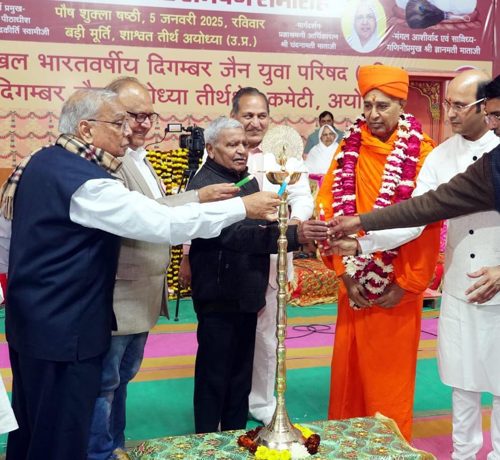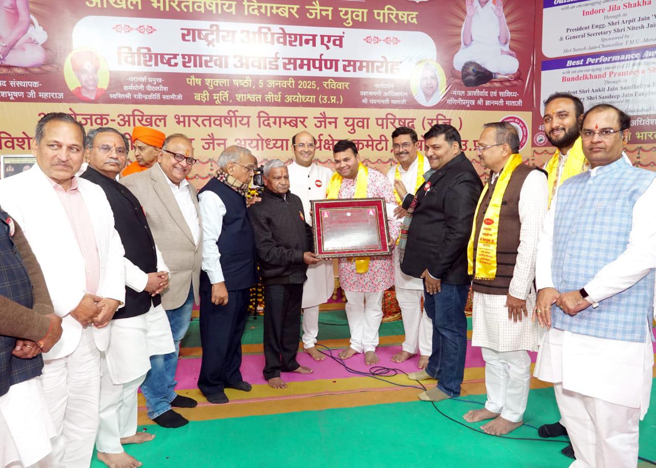 अखिल भारतवर्षीय दिगंबर जैन युवा परिषद् का 49 वां स्थापना दिवस के अवसर पर अवार्ड समर्पण व राष्ट्रीय अधिवेशन 5 जनवरी 2025 दोपहर 1:00 बजे शाश्वत तीर्थ, जैन धर्म के प्रथम तीर्थंकर भगवान ऋषभदेव की पावन धरा पर अयोध्या में परम पूज्य गणिनी प्रमुख श्री ज्ञानमती माताजी ससंघ , प्रज्ञाश्रमणी आर्यिका रत्न श्री चंदनामती माताजी , जगद्गुरु पीठाधीश श्री रवीद्रकीर्ति स्वामी जी के मार्गदर्शन , समारोह कीअध्यक्षता युवा परिषद के राष्ट्रीय अध्यक्ष डॉ जीवन प्रकाश जैन जम्बूद्वीप,हस्तिनापुर ने की एवं भारतवर्षीय तीर्थ क्षेत्र कमेटी के राष्ट्रीय अध्यक्ष जम्बू प्रसाद जैन गाजियाबाद के मुख्य आतिथ्य में संपन्न हुआ।