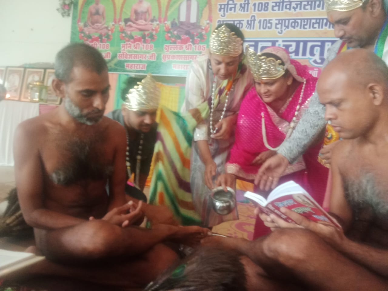 हाथ में पिछीका कमंडल मुख्य पहचान बताएं मुनि ने यह भी बताया कि पहले मनुष्य को अपने मन में शांति होना चाहिए शांति के बाद लोक की शांति उसके बाद संपूर्ण संसार की शांति ऐसी भावना भाना भी पुण्य का सचय होना मुनि ने बताया भगवान के जिनालयों में भक्ति दर्शन करने मात्र से मन को बहुत कुछ शांति प्राप्त होती है ईश्वर के दरबार में बिना मांगे भक्त को बहुत कुछ प्राप्त होता है यह सब भक्त के पुण्य का प्रभाव होना मुनि ने बताया