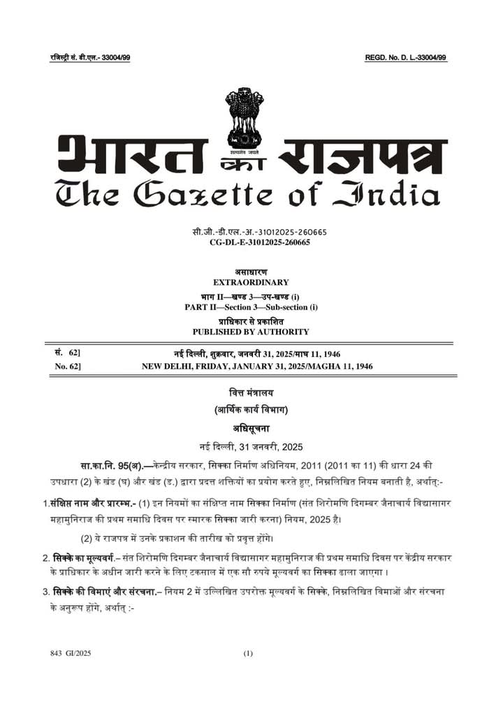 मुरैना (मनोज जैन नायक) दिगम्बराचार्य विद्यासागर महामुनिराज की प्रथम समाधि दिवस पर भारत सरकार ने स्मारक सिक्का जारी करने की अधिसूचना जारी की है ।