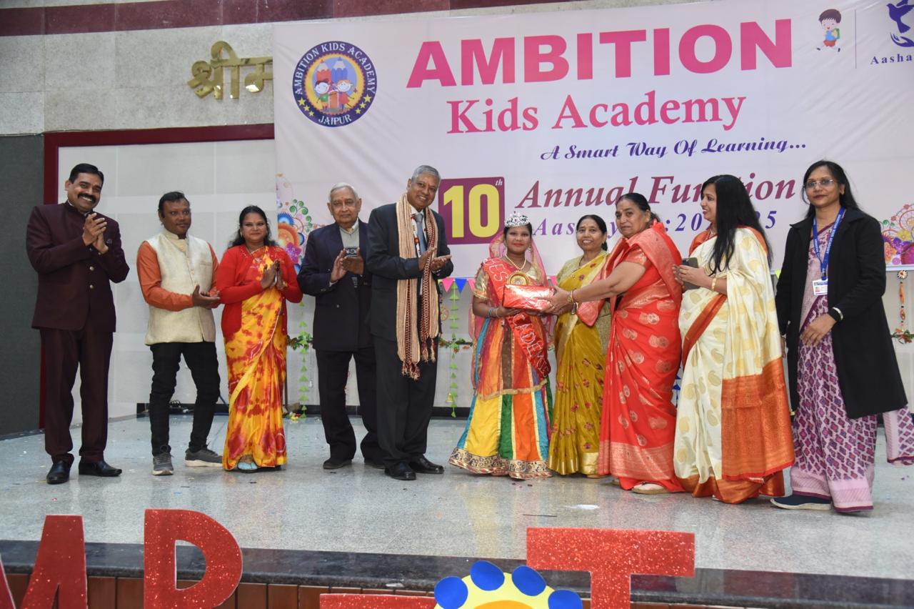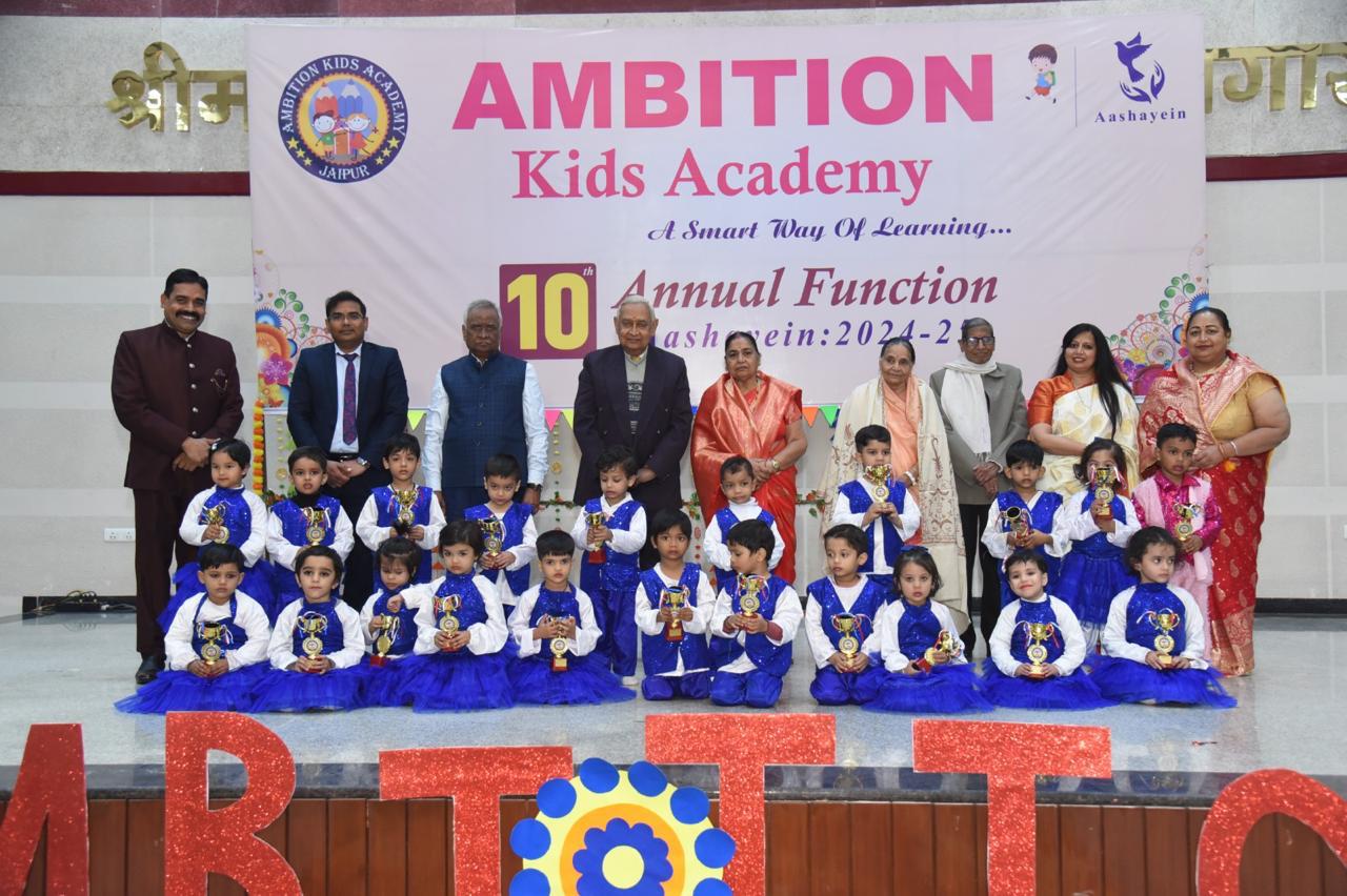 जयपुर में श्योपुर रोड, प्रताप नगर स्थित एम्बिशन किड्स एकेडमी ने दसवां वार्षिकोत्सव समारोह आशाएँ थीम पर आयोजित किया, जिसमें कक्षा नर्सरी से आठवीं तक के समस्त विद्यार्थियों ने रंगारंग प्रस्तुतियां देकर दर्शकों का मन मोह लिया, कार्यक्रम की शुरुआत मुख्य अतिथि श्रीमती एवं श्री केसर लाल पालीवाल , विशिष्ठ अतिथि डॉ एस एल जैन पंकज तथा सीनियर कार्डियोलॉजिस्ट डॉ सुप्रिय जैन ने माँ सरस्वती के श्री चरणों में दीप प्रज्वलित कर कार्यक्रम की शुरूआत की तथा सभी अतिथिगणों को तिलक,माला, शॉल तथा पगड़ी पहनाकर सम्मानित किया, कार्यक्रम में संस्था की उपाचार्या श्रीमती अनीता जैन ने बताया कि णमोकार मंत्र व गणेश वंदना के साथ कार्यक्रम का आगाज करते हुए प्री प्राइमरी कक्षा के विद्यार्थियों ने विभिन्न प्रकार के मनमोहक नृत्य प्रस्तुत किए जिसमें वरायटी ऑफ कलर्स, कव्वाली और बॉलीवुड के नए पुराने गीत शामिल थे