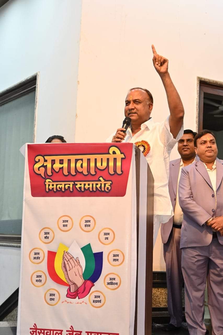 दिल्ली (मनोज जैन नायक) कर्म किए जा फल की इच्छा मत कर तू नादान, जैसे कर्म करेगा वैसा फल देगा भगवान । हम सभी की जीवन शैली कर्म सिद्धांत पर आधारित है । हम जैसे कर्म करते हैं, ईश्वर हमें उसी अनुरूप परिणाम देते हैं । जैन धर्म में क्षमावाणी का विशेष महत्व है । जैसवाल जैन युवजन दिल्ली द्वारा आयोजित क्षमावाणी मिलन समारोह से समाज में संगठन एकता और भाईचारे की भावना विकसित होगी । इतना भव्य आयोजन देखकर में प्रफुल्लित हूं । उक्त उद्गार राज्यसभा सांसद नवीन जैन (पी एन सी) आगरा ने विशिष्ट अतिथि की आसंदी से उपस्थित साधर्मी बंधुओं को संबोधित करते हुए व्यक्त किए ।