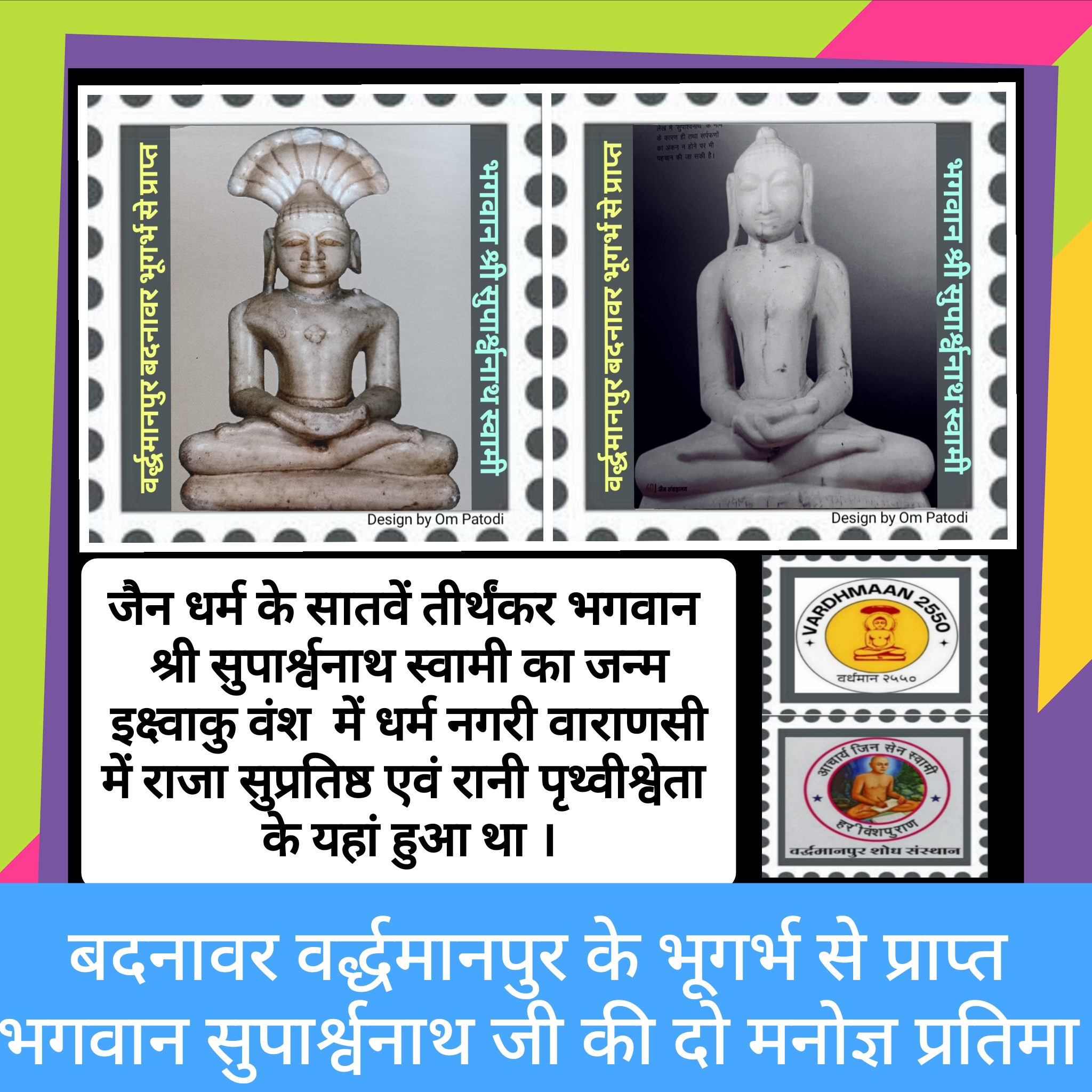 बदनावर। श्रमण संस्कृति सातवें तीर्थंकर श्री सुपार्श्वनाथ नाथ जी का जन्म जेष्ठ शुक्ला बारस के दिन प्राचीन धर्म नगरी वाराणसी में पिता सुप्रतिष्ठ राजा एवं माता पृथ्वीश्वेता देवी के हुआ था। आप इक्ष्वाकु वंश की थे। आपका निर्वाण प्रसिद्ध जैन तीर्थ श्री सम्मेद शिखर जी के प्रभास कुट से हुआ था। जहां प्रतिवर्ष लाखों भक्त दर्शन को जाते हैं। भगवान महावीर स्वामी के 2550 वे निर्वाण कल्याणक महोत्सव वर्ष एवं भगवान पार्श्वनाथ जी के 2800वे निर्वाण कल्याणक, 2900वे जन्म कल्याणक वर्ष के अन्तर्गत आये इस पर्व को सम्पूर्ण विश्व में जैन समाज द्वारा उत्साह और उमंग के साथ मंगलवार को मनाया जाएगा।