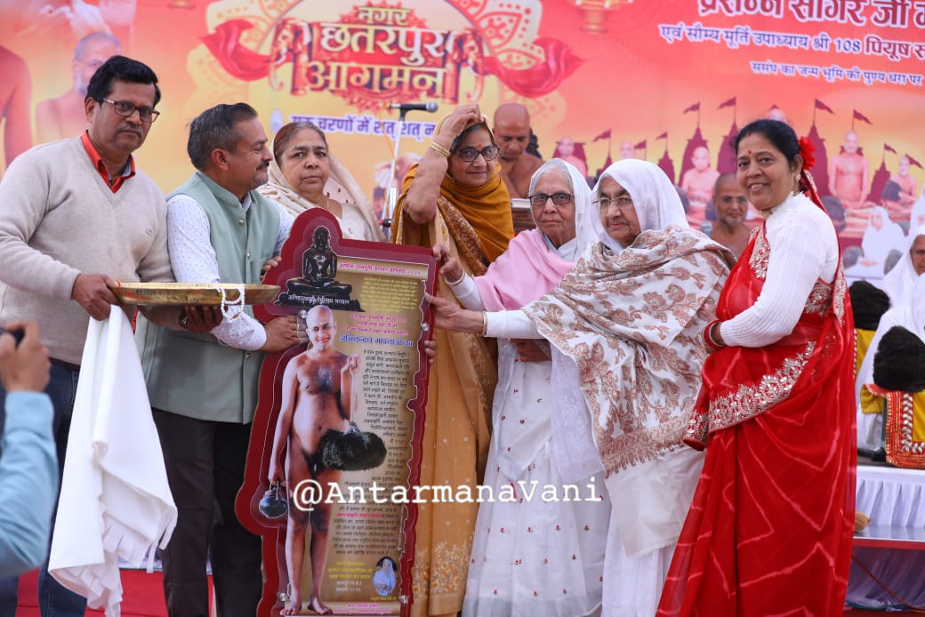 जैन समाज के प्रो. सुमति प्रकाश जैन एवं श्री पंकज जैन महर्षि ने बताया कि आचार्य श्री प्रसन्न सागर महाराज की ढोल नगाड़ों एवं बैंड बाजो के साथ सागर रोड स्थित चंदप्रभु चैत्यालय से भव्य आगवानी की गयी। इस अवसर सकल दिगंबर जैन समाज तथा विभिन्न महिला मंडलो की महिलाओं एवं जैन मिलन द्वारा आचार्य श्री की आरती उतार कर मंगल प्रवेश की आगवानी की गयी। तत्पश्यात आचार्यश्री सैकड़ो भक्तों के साथ बिजावर नाका, छत्रसाल चौक एवं पुरोहित चौराहे होते हुए पुरानी तहसील महलों पर पहुंचे जहां एक विशाल धर्म सभा का आयोजन किया गया। इस धर्म सभा मे छतरपुर विधायक श्रीमती ललिता यादव, खजुराहो विधायक अरविंद पटेरिया, नगरपालिका अध्यक्ष श्रीमती ज्योति सुरेंद्र चौरसिया,भाजपा नेता श्री पुष्पेंद्र प्रताप सिंह ‘गुड्डू भईया’ सहित अनेक गणमान्य नागरिक शामिल हुए।