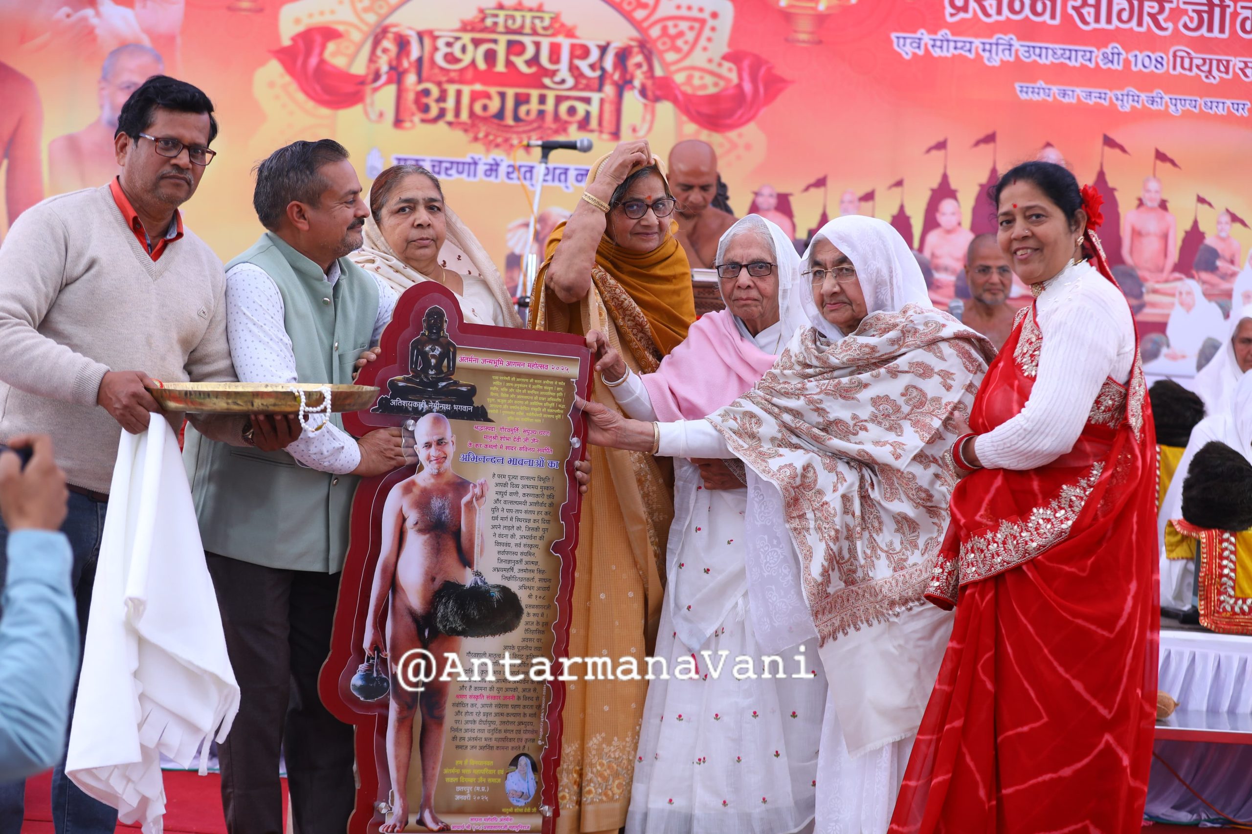जैन समाज के प्रो. सुमति प्रकाश जैन एवं श्री पंकज जैन महर्षि ने बताया कि आचार्य श्री प्रसन्न सागर महाराज की ढोल नगाड़ों एवं बैंड बाजो के साथ सागर रोड स्थित चंदप्रभु चैत्यालय से भव्य आगवानी की गयी। इस अवसर सकल दिगंबर जैन समाज तथा विभिन्न महिला मंडलो की महिलाओं एवं जैन मिलन द्वारा आचार्य श्री की आरती उतार कर मंगल प्रवेश की आगवानी की गयी। तत्पश्यात आचार्यश्री सैकड़ो भक्तों के साथ बिजावर नाका, छत्रसाल चौक एवं पुरोहित चौराहे होते हुए पुरानी तहसील महलों पर पहुंचे जहां एक विशाल धर्म सभा का आयोजन किया गया। इस धर्म सभा मे छतरपुर विधायक श्रीमती ललिता यादव, खजुराहो विधायक अरविंद पटेरिया, नगरपालिका अध्यक्ष श्रीमती ज्योति सुरेंद्र चौरसिया,भाजपा नेता श्री पुष्पेंद्र प्रताप सिंह ‘गुड्डू भईया’ सहित अनेक गणमान्य नागरिक शामिल हुए।