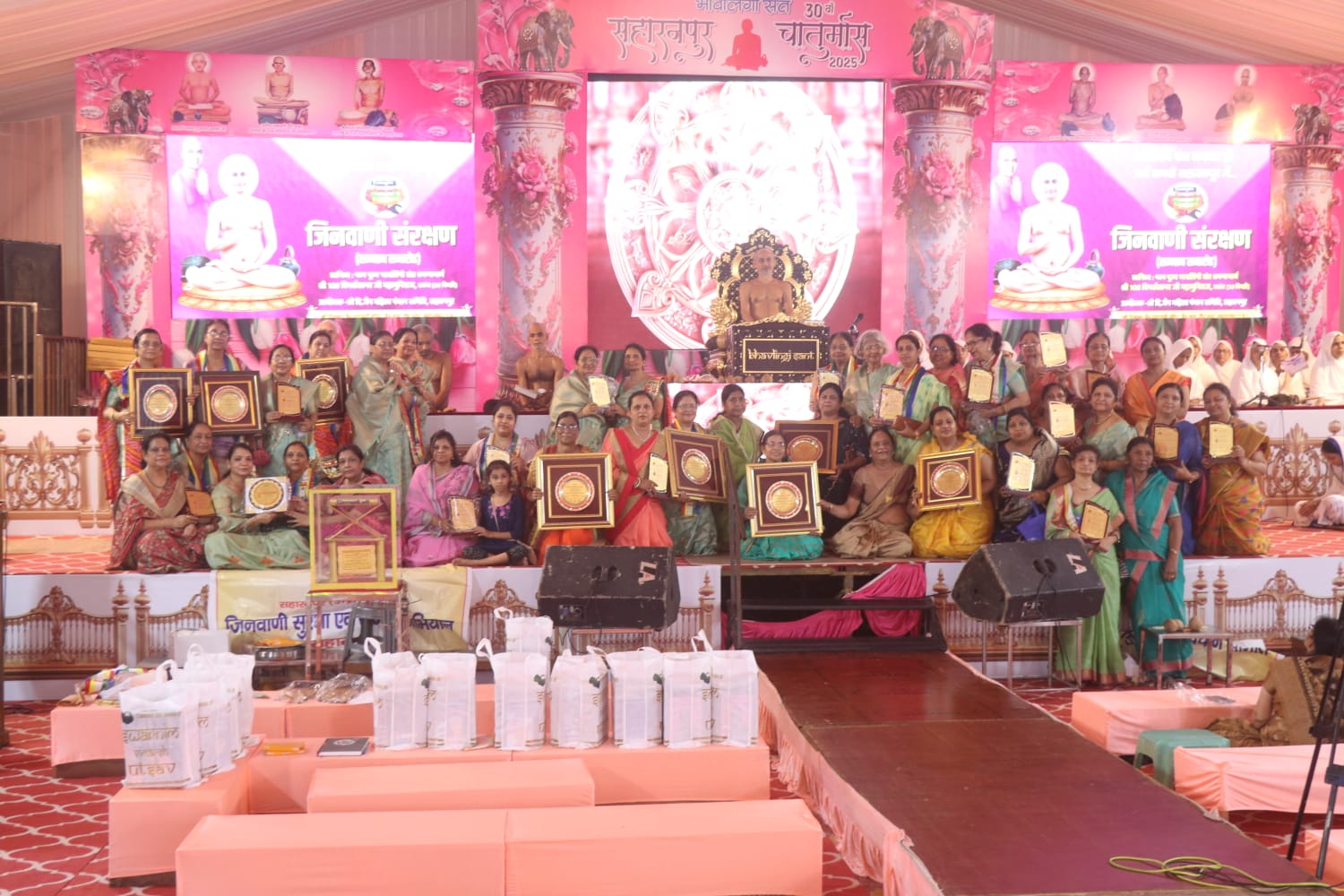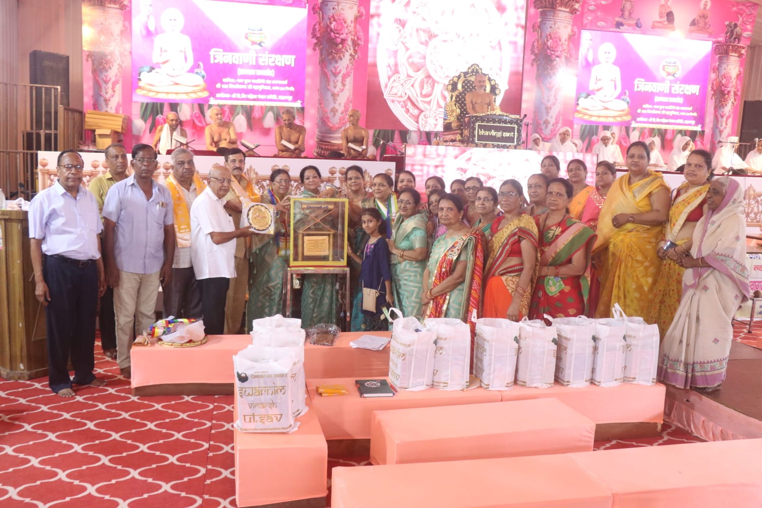 सहारनपुर उ० प्र०. भावलिंगी संत परम पूज्य आचार्य श्री 108 विमर्श सागर जी महामुनिराज ससंघ के पावन सानिध्य में ‘जिनवाणी सुरक्षा एवं सज्जा अभियान’ के अन्तर्गत श्री दि० जैन महिला पंचान समिति, महिला समाज सहारनपुर के सौजन्य से ‘अहोभाग्य तीर्थ क्षेत्र’ वीर नगर जैन बाग सहारनपुर में ‘सम्मान समारोह का भव्य हर्षौल्लास के मंगलमय वातावरण में आयोजन किया गया। धर्ममयी सहारनपुर नगरी के 25 दि० जैन जिनालयों में किये गये निरीक्षण का परिणाम घोषित कर 10 चल शील्डे शोरमियान, जानकी धाम, दीनानाथ, छत्ता बारूमल, मदनपुरी आदि जिनालयों की संयोजिकाओं को प्रदान की गई। सभी 25 जिनालयों की संयोजिका को श्री अरुण कुमार जैन (कोषाध्यक्ष जैन समाज) एवं श्रीमति शशी जैन (शिरोमणि संरक्षिका) के सौजन्य से शील्डों द्वारा सम्मानित किया गया।श्रुत पंचमी पर्व पर आयोजित अखिल भारतीय जिनवाणी सज्जा प्रतियोगिता जिसमे 3671 संयोजिका ने अपने जिनालयों की सज्जित जिनवाणी के फोटो भेजे थे उसमें सहारनपुर की संयोजिका रीता जैन शोरमियान ने षष्टम एवं साधना जैन बड़तला यादगार ने नवम स्थान प्राप्त किया था उन्हें भी भूषण स्वरूप मुकेश कुमार जैन चैरिटेबल ट्रस्ट मेरठ के सौजन्य से शील्ड द्वारा सम्मानित किया गया। राष्ट्रीय मीडिया पारस जैन “पार्श्वमणि” पत्रकार ने जानकारी देते हुवे बताया कि कार्यक्रम का कुशल संचालन डा० रेणु जैन (संस्थापिका जिनवाणी सुरक्षा एवं सज्जा अभियान, अध्यक्षा महिला समाज) द्वारा किया गया । श्री राकेश जैन (संरक्षक), श्री राजेश जैन (अध्यक्ष) श्री अनिल जैन सी-ए. सभी ने डा० रेणुजैन अध्यक्षा, सरिता जैन महामन्त्री, शोभा जैन कोषाध्यक्षा के कार्यों की मुक्त कंठ से प्रशंसा की। विगत 35 वर्षों से पत्रकारिता के क्षेत्र में उल्लेखनीय योगदान देने वाले पारस जैन “पार्श्वमणी” पत्रकार ने बताया अन्त में भावलिंगी सन्त आचार्य श्री विमर्श सागर जी महाराज की अमृतमयी वाणी से सभी सीचित हुये। आचार्य श्री ने कहा कि तीन लोक में यदि माँ की संज्ञा है तो वह जिनवाणी को है। हम सब सन्तान है चाहे बेटा हो या बेटी, मुनिराज हो या आर्यिका, श्रावक हो या श्राविका – जिनवाणी माता बिना भेदभाव के सबको अमृत रस का रसपान कराती है। जिनवाणी सुरक्षा एवं सज्जा का छोटा सा चिन्तन इतनी विशालता को प्राप्त हो गया है। 3671 संयोजिका व संयोजक एक साथ मिलकर माँ जिनवाणी की सेवा का कार्य जिनवाणी सुरक्षा एवं सज्जा अभियान के अन्तर्गत कर रहे हैं- मैं बहुत प्रफुल्लित हूँ, आनन्दित हूँ आपके इस परिश्रम को देखकर । माता बहने जब कुछ करने की ठान लेती हैं तो निश्चित रूप से वे अपने उस अभियान में अवश्य सफल होती हैं। जिनवाणी सुरक्षा एवं सज्जा अभियान एक भारतवर्षीय सकल दि० जैन समाज को जोड़ने का बहुत सुन्