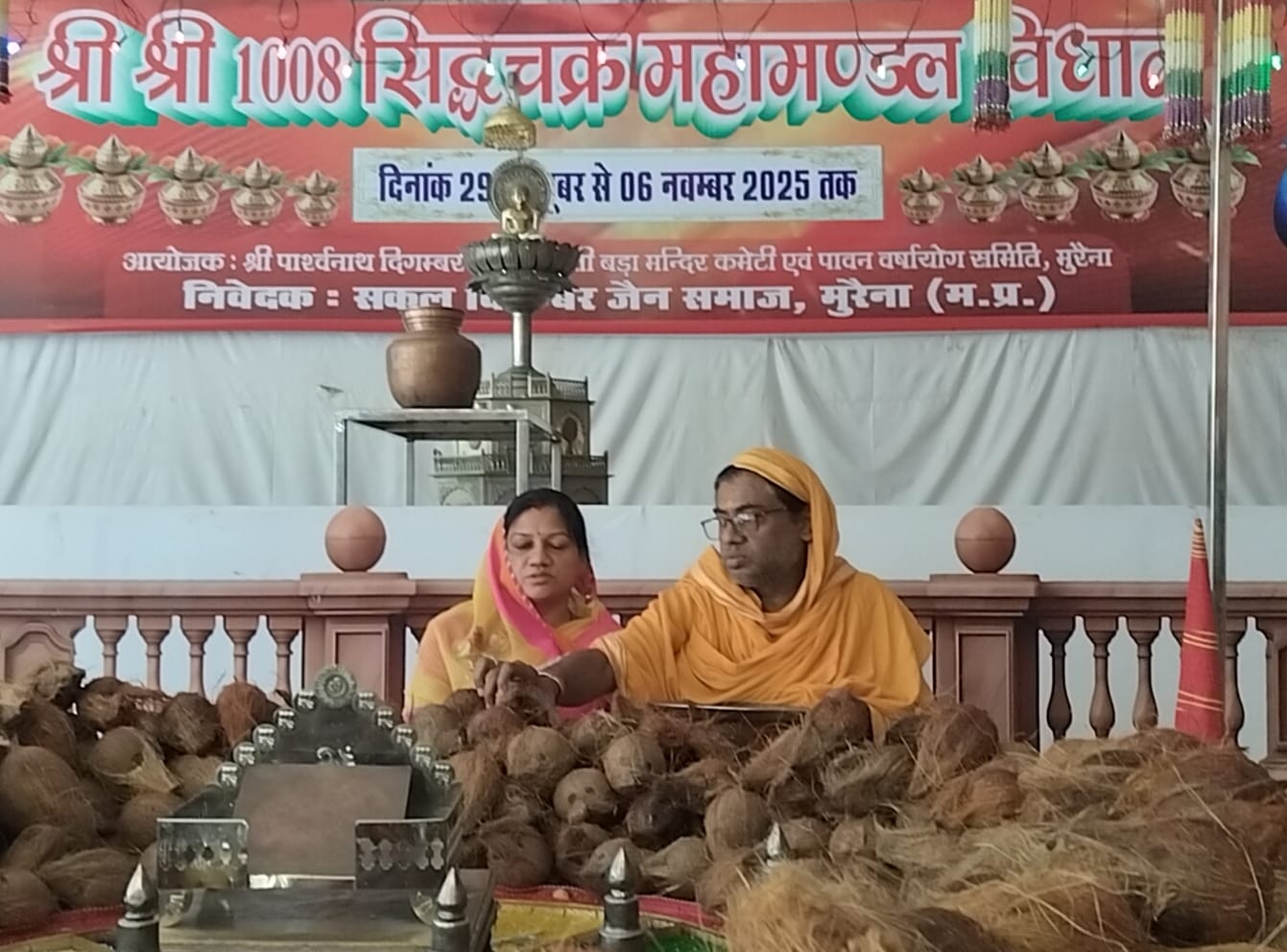 मुरैना (मनोज जैन नायक) आठ दिवसीय श्री सिद्धचक्र महामंडल विधान का आज 1024 अर्घ्य समर्पित करने के साथ समापन होगा । विधान समापन के अवसर पर कल प्रातः विश्व शांति एवं कल्याण के लिए महायज्ञ होगा एवं श्रीजी की भव्य नालकी शोभा यात्रा निकाली जाएगी ।