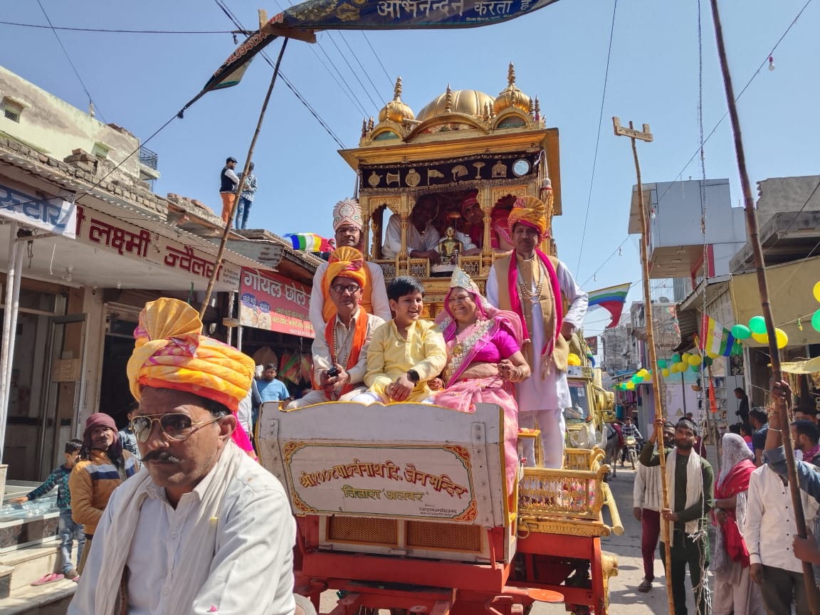 तिजारा से आया स्वर्ण रथ ; – निकला गया रथ देहरा तिजारा से आया तो स्वर्ण रथ देखकर लोग हर्षित हो गए खजांची के रूप में अजीत जैन बड़जात्या,तो खवासी धन कुमार जैन कोटा बने इस अवसर पर माता-पिता वीर चंद उषा जैन बड़जात्या, महायज्ञनायक पारस जैन मीरा जैन बडजात्या जयपुर बग्गी में विराजमान होकर चले। तो डीग, जेवर, उदयपुर के बैंडो क़ि घुन पर युवा वर्ग थिरकने लगा। वातावरण जैन धर्म के जयकारों से गुंजायमान हो गया।