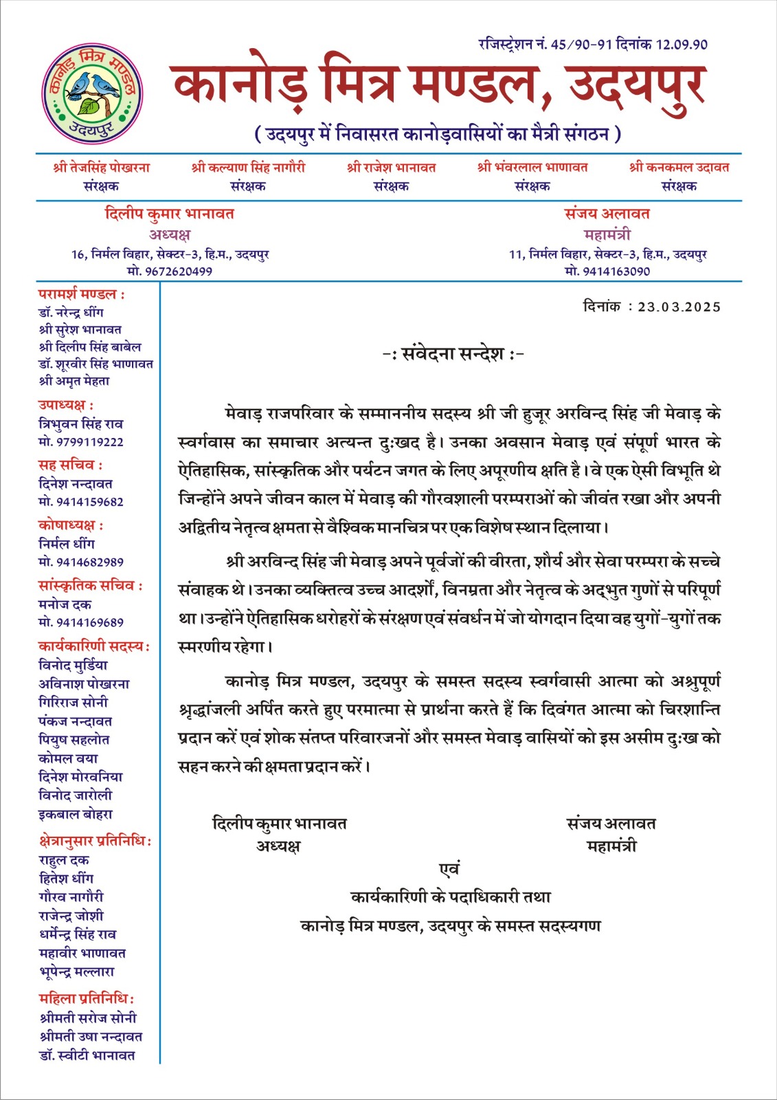 श्रद्धांजलि सभा के उपरांत श्रद्धा भाव श्री धर्म चन्द्र नागोरी ने रखते हुए हुजूर मेवाड़ के उल्लेखनीय कार्यो, समाज सेवा, राजस्थान, के साथ विश्व पटल पर उदयपुर, मेवाड़ को प्रतिस्थापित करने के योगदान को याद करते हुए समस्त कानोड मित्र मंडल की ओर से श्रद्धा सुमन अर्पित किये।