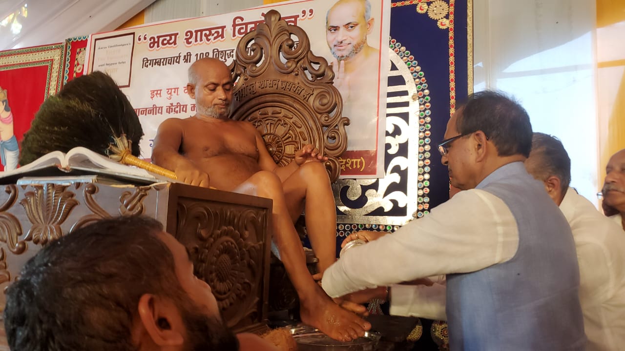 अपना जीवनसाथी अपने ही धर्म और रीती रिवाज का चुनों किसी मांसाहारी के रीती रिवाज का नहीं तभी आपका धर्म और जीवन सुरक्षित है इस अवसर पर मुख्य अतिथि शिवराज सिंह चौहान ने कहा कि संतों का सान्निध्य मिलना दुर्लभ सौभाग्य है, जब मेरे से पूंछा गया कि आपके पास कितना समय है तो मेंने कहा समय ही समय है में आचार्य श्री विद्यासागरजी महाराज का शिष्य हूं और आज तो आपके विचार ग्रंथ का विमोचन है और सारा खेल विचारों का ही है यह सारा संसार विचारों की ही उत्पत्ति है अच्छे विचारों से जीवन है तथा बुरे विचारों से ही पतन है उन्होंने बाल्मीकि कथा सुनाते हुये कहा कि परिवार में कोई उनकेपापों का कोई भागीदार नही मिला और एक घटना ने उनको डाकू से संत बना दिया उन्होंने कहा कि यह स्वार्थी संसार है और आपने जो विचार ग्रंथ लिखा है उस ग्रंथ से कई लोगों की जिंदगी बदलेगी। मुख्य अतिथि मंत्री जी ने कहा कि में यंहा पर कोई मंत्री के रुप में नहीं आया मैं तो आप से आशीर्वाद प्राप्त करने आया हूं मैं तो आचार्य विद्यासागरजी महाराज का शिष्य आपके चरणों में नतमस्तक होने और नमोस्तु शासन जयवंत हो करने आया हूं आपके दर्शन का सौभाग्य मिला उन्होंने देश और दुनिया की बात करते हुये कहा कि जिस भाषा में बड़े नेता बोल रहे है यह उनके बोलने का अधिकार नही है रुस, इजरायल और ईरान,हमास आदि देशों का नाम लेते हुये कहा कि चारों ओर अशांति है युद्ध के नगाड़े चारों ओर बज रहे है महा विनाशकारी अस्त्रों का जखीरा सामने है समझ में नहीं आता यह दुनिया सही दिशा में चलेगी कैसे? उन्होंने कहा कहा कि भारत अहिंसा परमो धर्मा के रास्ते पर चलने वाला देश है “विनाशकाले विपरीत बुद्धी”
