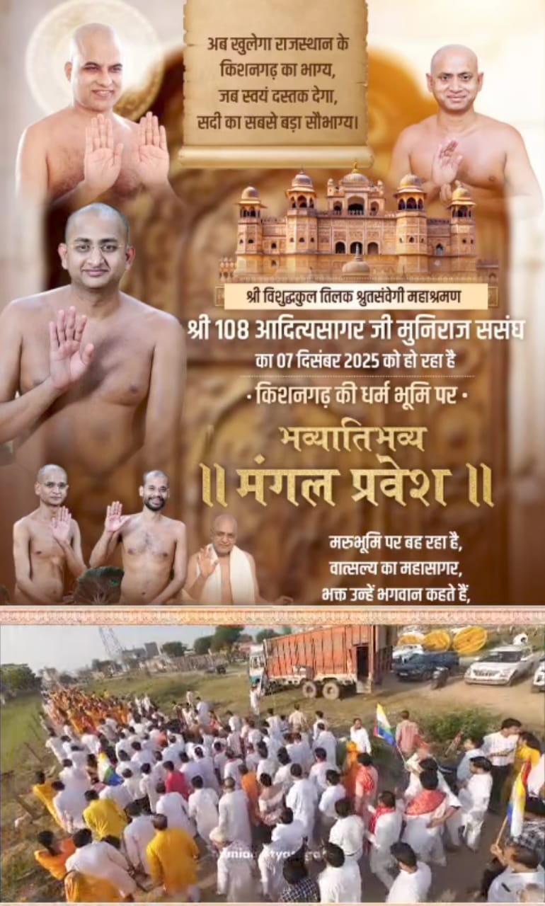 श्री विशुद्धकुल तिलक श्रुतसंवेगी महाश्रमण श्री 108 आदित्यसागर जी महामुनिराज ससंघ का 07 दिसंबर रविवार 2025 को हो रहा है किशनगढ़ की धर्म भूमि पर भव्यातिभव्य मंगल प्रवेश। राजस्थान की
