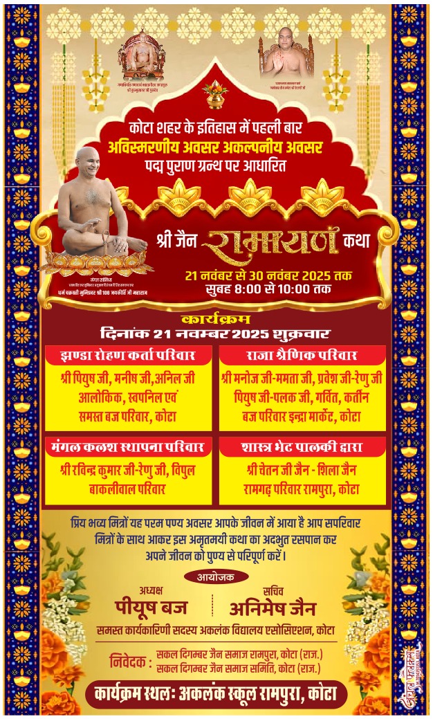 कोटा के इतिहास में प्रथम बार होगा अविस्मरणीय अवसर पद्म पुराण पर आधारित जैन रामायण कथा का भव्य आयोजन