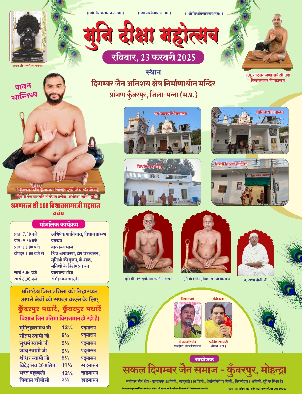 भारत का प्रथम स्थान कुंवरपुर जिला पन्ना मध्य प्रदेश जहां पर पद्मासन में 9:15 फीट की तीन अनुबद्ध केवली, पद्मासन में 9:15 फीट की श्रीधर केवली यह कुंडलपुर से मोक्ष पधारे हैं, खड़गासन में 11:15 फुट की विशाल विदेह क्षेत्र की 20 तीर्थंकर की प्रतिमा, खड़गासन में 12:15 फुट की भरत बाहुबली की प्रतिमा एवं पद्मासन में 12:15 फुट की मुनिसुव्रत नाथ भगवान की प्रतिमा एवं खड़गासन में त्रिकाल चौबीसी 3:45 फीट की जिन प्रतिमा विराजमान होने जा रही हैं मंदिर का निर्माण तीव्र गति से चल रहा है आप यहां पर आकर विशाल विशाल जिन प्रतिमा को एवं विशाल निर्माणाधीन मंदिर को निहार कर अपना सौभाग्य प्राप्त करें , तथा 23 फरवरी को परम पूज्य गुरुदेव मुनि श्री 108 विश्रांत सागर जी महाराज का दीक्षा दिवस भी है एक बार में दो सौभाग्य प्राप्त करें, आपका यहां आना ही हमारा परम सौभाग्य होगा दिगंबर जैन समाज कुंवरपुर आपसे विशेष निवेदन करती है कि आप यहां पर आकर हमारा उत्साहवर्धन जरूर करें गुरुदेव ने आपको मंगल आशीर्वाद दिया है