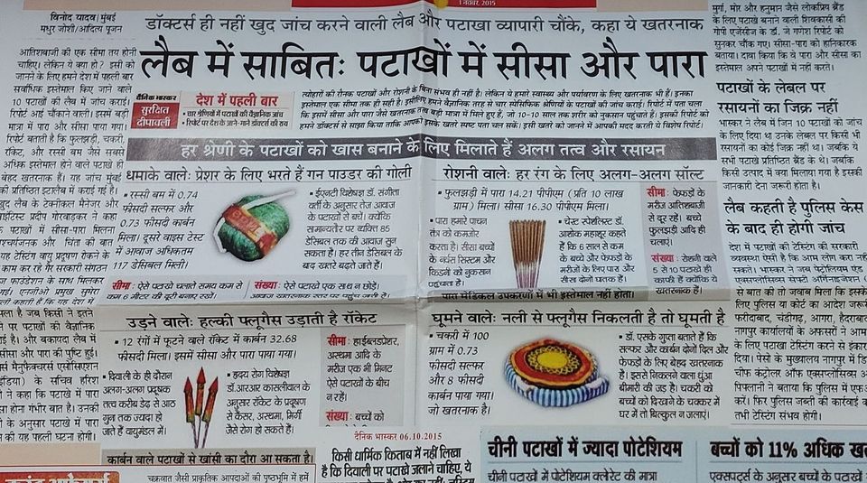 आतिशबाज़ी बनाने वालों और प्रयोगशाला में काम करने वालों ने मिलकर फाटकों की जाँच की तब पाया गया कि इनमे पारा और सीसा बहुत अधिक पाया जाता हैं जो न केवल हमारे स्वास्थ्य के लिए वरन पर्यावरण के लिए अत्यंत हानिकारक हैं . ये खरतनाक तत्व हमारे शरीर में दस दस वर्ष तक नुक्सान पहुंचाते हैं .यहाँ फटाके चार श्रेणी में रखे गए हैं १ धमाके वाले — प्रेसर के लिए भरते हैं गन पाउडर रस्सी बम्ब में .074 % सल्फर और ०.73 % कार्बन मिला रहता हैं .दूसरे वॉइस टेस्ट (आवाज ) अधिकतम 117 डेसीबल .सामान्य तौर से फटाकों के उपयोग से बचे और मनुष्य 85 डेसीबल तक आवाज सहन कर सकता हैं .