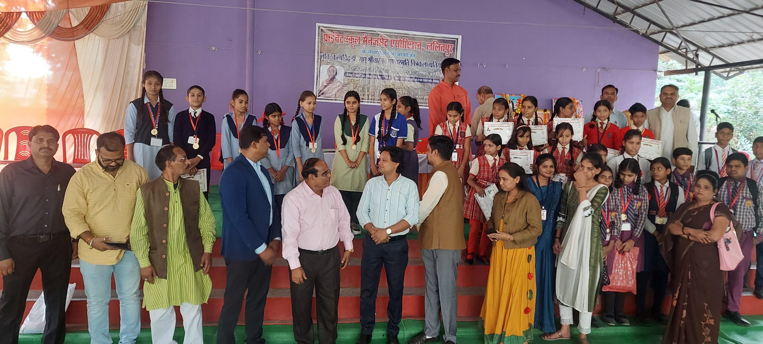 ललितपुर। लोक कलाविद डा.मधु श्रीवास्तव की स्मृति में प्राइवेट स्कूल मैनेजमेंट एसोसिएशन ललितपुर द्वारा चित्रकला प्रतियोगिता का आयोजन स्थानीय आर.ई.मिशन स्कूल में किया गया। कार्यक्रम के मुख्य अतिथि जनपद ललितपुर के सुप्रसिद्ध चित्रकार ओमप्रकाश बिरथरे रहे एवं अध्यक्षता प्राइवेट स्कूल मैनेजमेंट एसोसिएशन के जिलाध्यक्ष मोहन ने की। कार्यक्रम में जनपद के 21 निजी विद्यालयों के छात्र-छात्राओ ने प्रतिभाग किया। इस अवसर पर मुख्य अतिथि ओमप्रकाश बिरथरे ने कहा कि कला आत्म अभिव्यक्ति का माध्यम है। कल पूजा है कल साधना है कल के माध्यम से लोगों ने बड़े-बड़े मुकाम हांसिल किए हैं। कहा उन्होंने अपना जीवन कला के लिए समर्पित किया है। आज भी उनके द्वारा जनपद में कल की प्रतिभाओं को निखारने के लिए लगातार प्रयास किया जा रहा है। इस अवसर पर झांसी से पधारे हुए कलाकारों मोइन अख्तर चित्रकार कला शिक्षक, विक्रांत झा चित्रकार तालबेहट, कुमारी रजनी वर्मा कल प्रवक्ता सैनिक स्कूल झांसी एवं दिनेश कुमार श्रीवास्तव ने भी अपने विचार व्यक्त किये। इस अवसर पर प्राइवेट स्कूल मैनेजमेंट एसोसिएशन के अध्यक्ष मोहन सैनी, कार्यक्रम संयोजक धु्रव साहू, अजय श्रीवास्तव, जयशंकर प्रसाद द्विवेदी, अक्षय अलया, आकाश मसीह, सर्वेश श्रीवास्तव मूर्तिकार ललितपुर, राजीव शुक्ला पत्रकार, आचार्यजी लक्ष्मी नारायण विश्वकर्मा, पुष्पेंद्र आदि ने प्रमुख रूप से प्रतिभाग किया। प्रतियोगिता में गोल्डन रोज पब्लिक स्कूल गोविंद नगर, मां सरस्वती ज्ञान मंदिर जूनियर हाई स्कूल नेहरू नगर, मां शारदा इंटर कॉलेज, प्रशांति विद्या मंदिर जूनियर हाई स्कूल गांधीनगर, प्रशांति विद्या मंदिर गोविंद नगर, प्रशांति एजुकेशनल एकेडमी गोविंद नगर, एनपीएसडी एकेडमी नेहरू नगर, स्याद्वाद बाल संस्कार केंद्र, सरस्वती ज्ञान मंदिर बालिका इंटर कॉलेज आजादपुरा, सेंट्रल पब्लिक स्कूल, रोटरी पब्लिक स्कूल, लिटिल फ्लावर स्कूल, आर ई मिशन जूनियर हाई स्कूल, राम रतन विद्या मंदिर जूनियर हाई स्कूल, महाराजा अग्रसेन पब्लिक स्कूल, सिटी मांटेसरी पब्लिक स्कूल, सिद्धि सागर एकेडमी स्कूल, जय गुरुदेव प्ले स्कूल, जय गुरुदेव बाल विद्या मंदिर, मां शारदा जूनियर हाई स्कूल इंग्लिश मीडियम आदि के बच्चों ने प्रतियोगिता में प्रतिभा किया। कार्यक्रम का सफल संचालन प्राइवेट स्कूल मैनेजमेंट एसोसिएशन के वरिष्ठ उपाध्यक्ष विजय सिंह यादव ने किया।