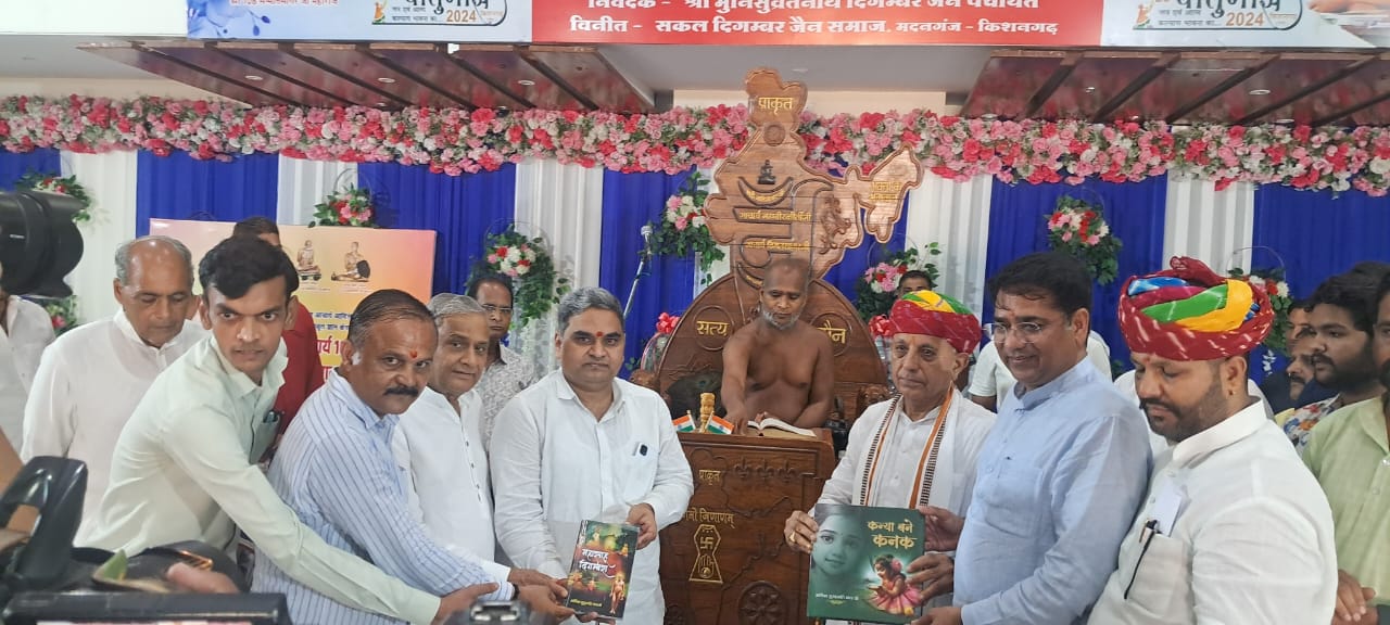 मदनगंज किशनगढ़ में विराजमान आचार्य सुनील सागर महाराज के दर्शनार्थ पधारे अनेक राजनेताओं ने मंगलमय मय आशीर्वाद प्राप्त कर पुण्यलाभ प्राप्त किया जैन महासभा के प्रतिनिधि राजाबाबू गोधा ने अवगत कराया कि कार्यक्रम में क्षेत्रीय सांसद एवं केंद्रीय कृषि मंत्री भागीरथ चौधरी, राजस्थान सरकार के सहकारिता मंत्री गौतम दक, जल संसाधन मंत्री सुरेश रावत, देवनारायण बोर्ड अध्यक्ष ओम भंडाना, नगर निगम अजमेर के उप पहापोर नीरज जैन ने दर्शन कर पाद प्रक्षालन करते हुए आशीर्वाद प्राप्त किया , कार्यक्रम में इस दौरान महाशाहु दिगम्बरा, कन्या बनी कनक का विमोचन किया, कार्यक्रम में आचार्य श्री ने कृषि में नवाचार करने, प्राकृतिक खेती को बढ़ावा देने, सक्षम लोगों को आरक्षण नहीं देने के अलावा किसानों को कृषि हेतु पानी समय पर मिले आदि मुद्दों पर चर्चा की। आचार्यश्री ने कहा कि वनों का महत्व हमे तीर्थंकर भगवान के जीवन चरित्र में मिलता है। भगवान महावीर के 2550 में निर्वाण वर्ष पर सभी जगह 2550 साल के पेड़ लगाने का आह्वान किया। उन्होंने बताया कि भगवान महावीर स्वामी ने साल के पेड़ के नीचे तप किया था। कार्यक्रम में भागीरथ चौधरी ने केंद्र सरकार की प्राकृतिक खेती को बढ़ावा देने की योजना तथा सुरेश रावत ने नदिया जोड़ने की योजना की जानकारी दी। इस दौरान अन्य अतिथियों ने भी अपने विचार व्यक्त किया। हरियाली अमावस्या पर आर. के. कम्यूनिटी सेंटर में अतिथियों ने साल का पेड लगाया। वर्षा योग समिति द्वारा अतिथियों का तिलक लगाकर, माला पहनकर, स्मृति चिन्ह देकर स्वागत किया गया। मंच संचालन अजीत बाकलीवाल ने किया। इस दौरान आर. के. मार्बल चेयरमैन अशोक पाटनी, श्री मुनिसुव्रतनाथ दिगंबर जैन पंचायत अध्यक्ष विनोद पाटनी, मंत्री सुभाष बड़जात्या, प्रदीप गंगवाल, प्रकाश काला, मुकेश काला, महेंद्र पाटनी, अशोक पापल्या, कमल रांवका, सुशील अजमेरा, चंद्र प्रकाश वैद, संजय जैन, अजीत बाकलीवाल, मांगीलाल झांझरी, अरविंद वैद तथा सुभाष चोधरी आदि मौजूद रहे।