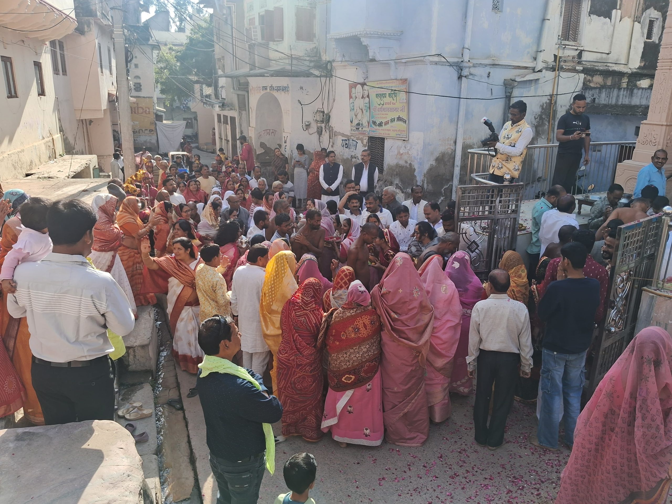 जहां मंदिर कमेटी ने पादप्रक्षालन करके अगुवानी की। इस दौरान जैन संतों का जयधोष के साथ जुलूस रवाना होकर बड़ा जैन मंदिर चतुर्भुज बाजार बंपुई वाली धर्मशाला में चंद्रप्रभु जैन मंदिर अहिंसा सर्किल भगवान महावीर मार्ग होते हुए श्री शांतिनाथ दिगम्बर जैन अग्रवाल मंदिर पहुंचा जहां सुशील आरामशीन विष्णु बोहरा सुनील भाणजा नवरत्न टोंग्या निखिल जैन महेन्द्र चंवरिया मनोज पाटनी महावीर प्रसाद पहाड़ी सन्मति चंवरिया महावीर प्रसाद पराणा रामपाल चंवरिया नेमीचंद सिरस पवन बोहरा सुशील गिन्दोडी़ महावीर प्रसाद माधोराजपुरा गोपाल कठमाणा त्रिलोक सिरस दिनेश गिन्दोडी़ ज्ञानचंद सोगानी शंभु कठमाणा सहित अनेक गणमान्य लोगों ने पाद्प्रक्षालन एवं आरती उतारकर अगुवानी करने का परम सौभाग्य प्राप्त किया । इस दौरान मंदिर परिसर में धर्म सभा आयोजित हुई जिसमें पादप्रक्षालन करने का सौभाग्य भंवरलाल चांदसेन मालपुरा एवं शास्त्र भेंट करने का सौभाग्य हुकमचंद संजय जैन बड़ागांव को मिला। सभा का मंगलाचरण विमल पाटनी ने किया। इससे पूर्व बुधवार को नेशनल हाईवे स्थित चेनपुरा इंडस्ट्रीज नूतन आचार्य शांतिसागर भवन पहुंचे जहां उधोगपति सुशील नीरा जैन विष्णु ममता बोहरा रामपाल चंवरिया विमल जौंला अशोक रजवास सहित अनेक गणमान्य लोगों ने पाद्प्रक्षालन एवं आरती उतारकर अगुवानी की उसके पश्चात आचार्य शांतिसागर भवन का लोकार्पण करने का सौभाग्य सुशील नीरा जैन राहुल जैन आरामशीन को मिला। श्री दिगम्बर जैन अग्रवाल समाज अध्यक्ष विष्णु बोहरा एवं विमल जौंला ने बताया कि उपाध्याय विकसंत सागर महाराज संध एवं मुनि समत्व सागर महाराज सहित अनेक जैन मुनियो का विज्ञा तीर्थ में मंगल प्रवेश हुआ। विज्ञा तीर्थ पर गणिनी आर्यिका विज्ञा श्री माताजी संध से सभी जैन संतों का मिलन हुआ। मंगल प्रवेश जुलूस में विशुद्ध वर्धनी महिला मण्डल, जिन श्री महिला मण्डल, णमोकार महिला मण्डल, चंद्रप्रभु महिला मण्डल, शांतिसागर पाठशाला के बालक बालिकाओं सहित अनेक संस्थाओं के महिलाएं और पुरुष मौजूद थे