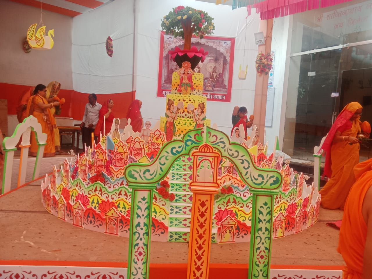 भगवान को शमोशरण में विराज कर उनकी अर्चना पूजा अभिषेक शांति धारा मुनि श्री के सानिध्य में संपन्न हुई