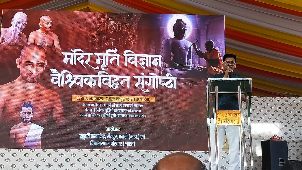 सैदपुर (पठारी)। विदिशा जिले के पठारी क्षेत्र अंतर्गत सैदपुर गांव में 3 जून से 5 जून 2025 तक त्रिदिवसीय राष्ट्रीय मूर्ति कला संगोष्ठी का भव्य आयोजन संपन्न हुआ। कार्यक्रम का शुभारंभ परम पूज्य आचार्य श्री विद्यासागर जी महाराज के परम शिष्य मुनि श्री दुर्लभ लसागर जी महाराज के पावन सान्निध्य में दीप प्रज्वलन एवं मंगलाचरण के साथ हुआ। संगोष्ठी के संयोजक व शास्त्री परिषद के महामंत्री ब्र. जयकुमार जी निशान्त ने बताया कि संगोष्ठी का उद्देश्य प्राचीन भारतीय मूर्तिकला परंपरा को समर्पित चिंतन, विमर्श और आधुनिक संदर्भों में उसकी पुनर्परिभाषा रहा। आयोजन आचार्य श्री समयसागर जी महाराज के आशीर्वाद, निर्यापक मुनि श्री अभयसागर जी महाराज की प्रेरणा व मुनि श्री दुर्लभ सागर जी के सान्निध्य में सफलता पूर्वक संपन्न हुई। प्राचीन जैन मंदिर एवं मूर्तिकला परंपरा को पुनर्जीवित करने के उद्देश्य से मंदिर एवं मूर्ति विज्ञान पर इतिहास की पहली वैश्विक कार्यशाला का भव्य आयोजन सैदपुर (पठारी) में किया गया।