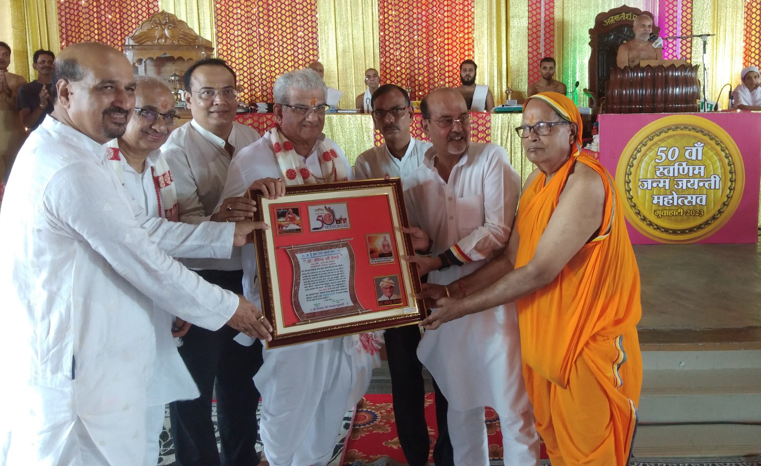 गुवाहाटी : हिंदी राष्ट्रभाषा से मुझे बहुत प्यार है। असम की धरती पर इतनी दूर से महाराज जी 2000 कि.लो.पेडल असम आए है। भारत मे ब्रह्मपुत्र को छोड़ कर कावेरी, नर्मदा, गंगा,सब स्त्रिलिंग नदी है। मुझे इतनी खुशी है कि मैं और मेरा भाई सुरेंद्र दोनों इधर आए और 2 दिन पूरा शहर का जो धर्म स्थान है उधर दर्शन किया और महाराज जी का दर्शन हुआ। मंदिर का दर्शन हुआ और आपके साथ दो दिन आपके धर्म दृष्टि को समझा और मनीष भाई वह दो दिन से हमारे साथ रहा है और हमारी पूरी सेवा कि है और यह आगे भी सेवा करने का बहुत उत्सुक है और यह माइनॉरिटी मेंबर भी है।डॉ. हेगडे ने कहा कि कर्नाटक धर्म स्थल में 15000 औरतों को हर महीने पेंशन मिल रहा है, खाना मिल रहा है, रक्षा भी कर रहे है, यह सब महाराज जी की सेवा और आशीर्वाद का फल है। उन्होंने आचार्य श्री का आभार प्रकट किया। तत्पश्चात आचार्य श्री ने डॉ.हेगडे को सिंपल सा मानव की उपाधि देते हुए कहा कि हमारी भारतीय संस्कृति को हमारी जैन संस्कृतिको देखना है तो कर्नाटक में बाहुबली गोमतेश्वर के धर्मस्थल मे साफ सफाई को देखकर अंदाजा लगाया जा सकता है कि हमारे किचन में भी इतनी साफ सफाई नहीं मिलेगी। आचार्य श्री ने कहा कि वहां पर भी दिगंबर जैन पंचायत गुवाहाटी के द्वारा निर्मित असम भवन है, जो एक सुंदर होटल जैसा बनाया गया है। इससे पूर्व आज आचार्य श्री प्रमुख सागर महाराज का 23वे दीक्षा दिवस के उपलक्ष में 51 फुट लंबा ध्वजा फैराया गया। इस अवसर पर डॉक्टर हेगेडे़ द्वारा विभिन्न धार्मिक किताबों का विमोचन भी किया गया एवं गिनीज बुक ऑफ़ वर्ल्ड रिकॉर्ड द्वारा आचार्य श्री को अशोक जैन छाबड़ा को एवं महावीर जैन गंगवाल को गिनीज बुक ऑफ़ वर्ल्ड रिकॉर्ड के मनीष जैन द्वारा पुरस्कार प्रदान किया गया। प्रचार प्रसार विभाग के मुख्य संयोजक ओम प्रकाश सेठी ने बताया की मर्यादा एवं स्वर्णिम जयंती महोत्सव के उपलक्ष में आज प्राप्त भगवान महावीर धर्म स्थल से आचार्य श्री ससंघ के सानिध्य में एक शोभायात्रा निकाली गई। जो विभिन्न मार्गो से होती हुई वापस आयोजन स्थल में पहुंची।जहां विभिन्न कार्यक्रमों का आयोजन किया गया। यह जानकारी समाज के प्रचार प्रसार विभाग कै सहसंयोजक सुनील कुमार सेठी द्वारा दी गई है।।