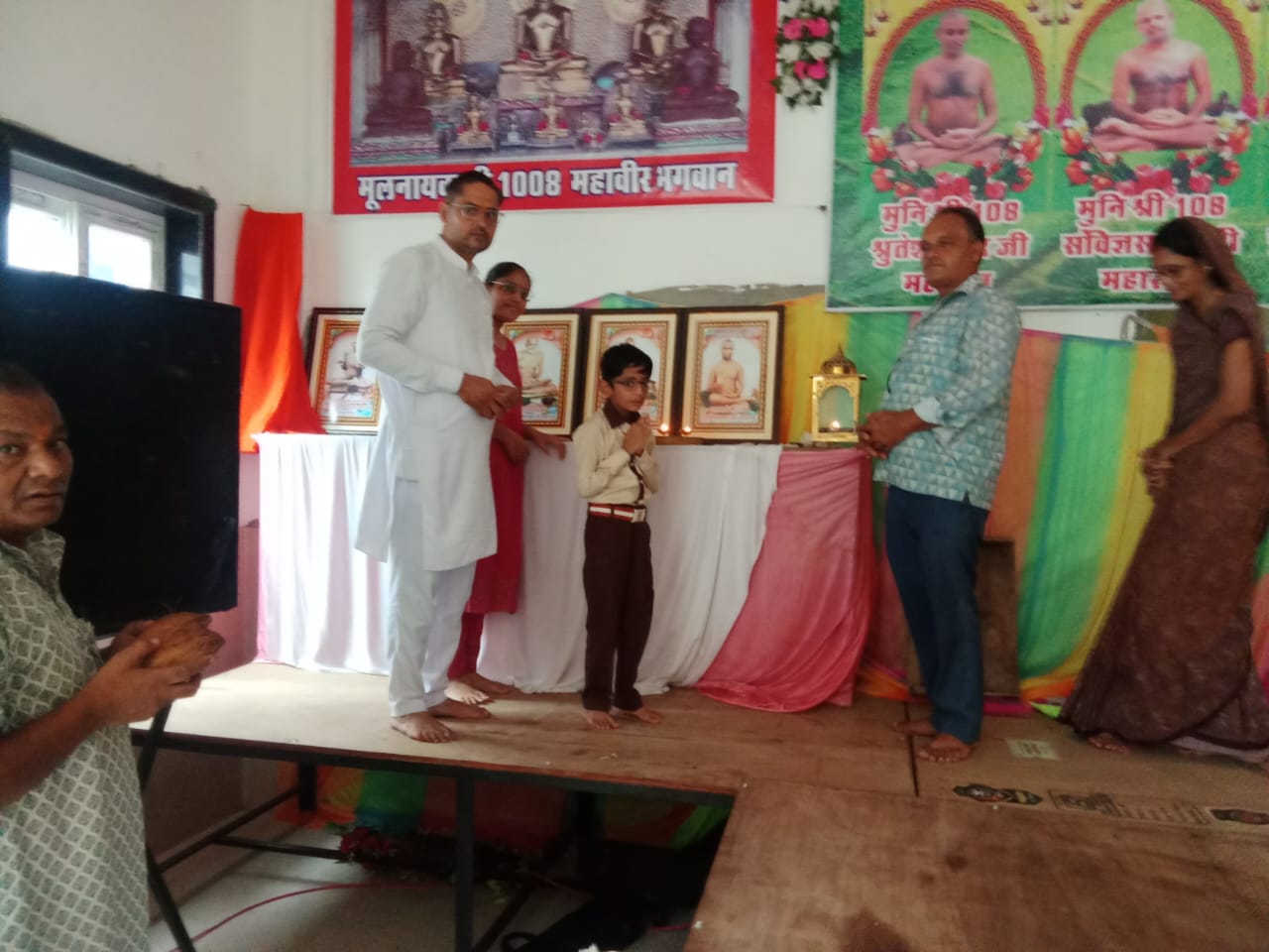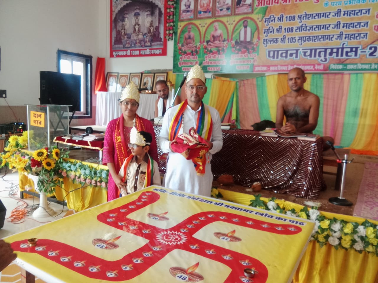 आज भक्तामर के पुनार्जन सूरजमल मुजिब जयंत मयंक सोगानी परिवार द्वारा चित्र का अनावरण दीप प्रज्वलित मुनि के पाद पक्षालन एवं मंगलाचरण की प्रस्तुति दी