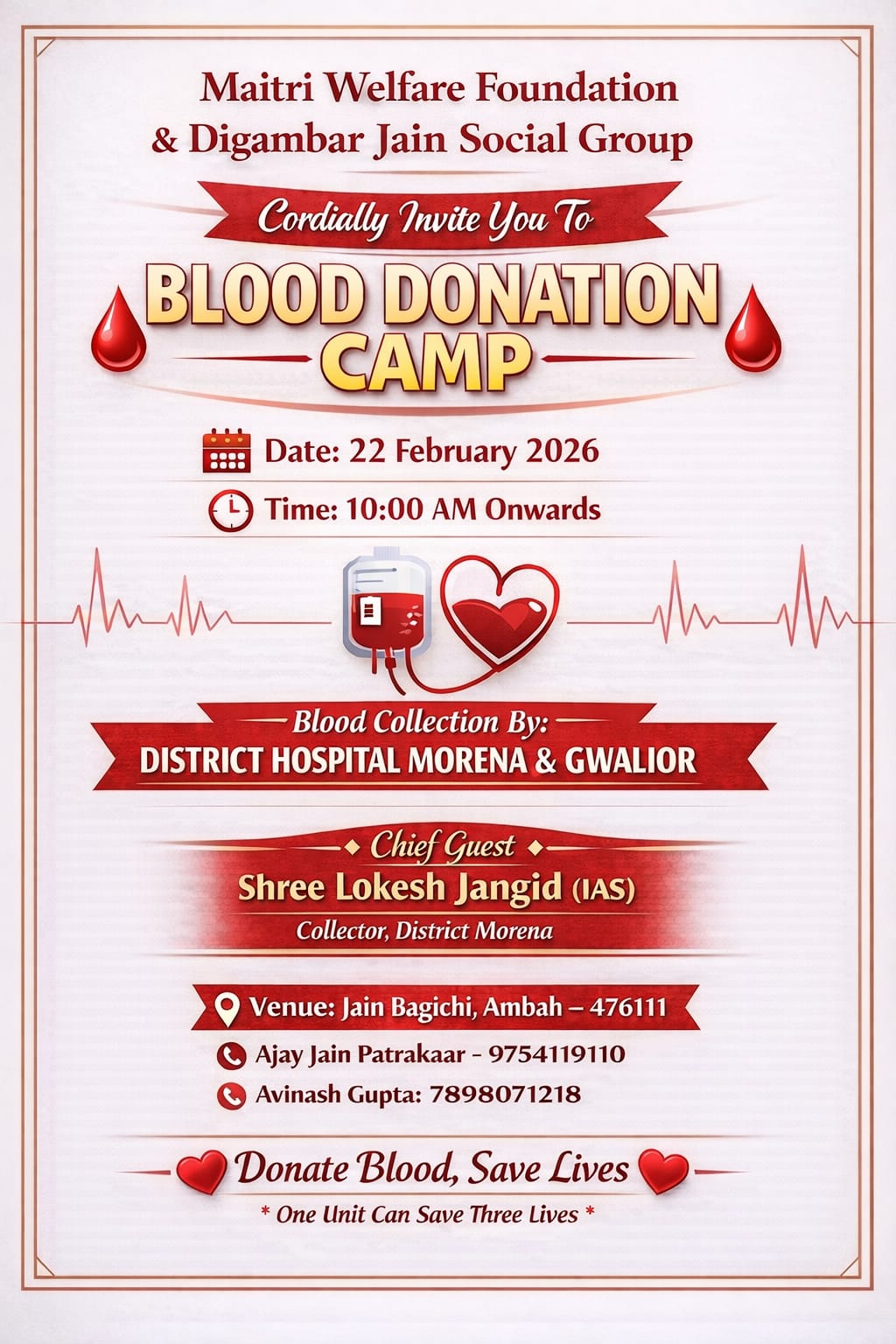 अम्बाह (मनोज जैन नायक) समाज सेवा और मानवता के प्रति सामाजिक जिम्मेदारी के तहत मैत्री ग्रुप फाउंडेशन एवं दिगंबर जैन सोशल ग्रुप द्वारा रविवार, 22 फरवरी को रक्तदान शिविर का आयोजन किया गया है । यह शिविर जैन बगीची, अंबाह में प्रातः 10:00 बजे से आरंभ होगा। शिविर में रक्त संग्रह हेतु जिला अस्पताल मुरैना और ग्वालियर की टीम मौजूद रहेगी। आयोजन का उद्देश्य समाज में सेवा भाव और मानवता को बढ़ावा देना है। आयोजकों ने सभी नागरिकों से अपील की है कि वे इस अवसर पर उपस्थित होकर रक्तदान कर जीवन बचाने में योगदान दें। आयोजकों का कहना है कि एक यूनिट रक्त से कई जीवन बचाए जा सकते हैं। मैत्री फाउंडेशन के अध्यक्ष दिनेश गुप्ता एवं अवनीश गुप्ता राधे और दिगंबर जैन सोशल ग्रुप के अध्यक्ष संतोष जैन ने कहा है कि शिविर में भाग लेकर इच्छुक रक्तदाता न केवल समाज के लिए पुण्य कार्य करेंगे, बल्कि जरूरतमंदों के जीवन में आशा की किरण भी बनेंगे।