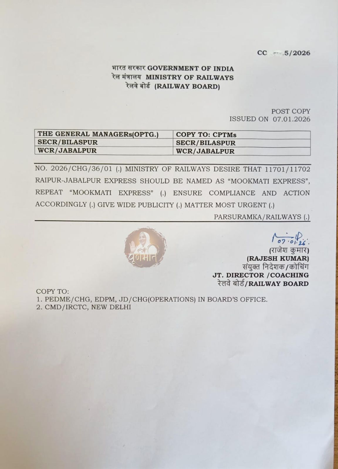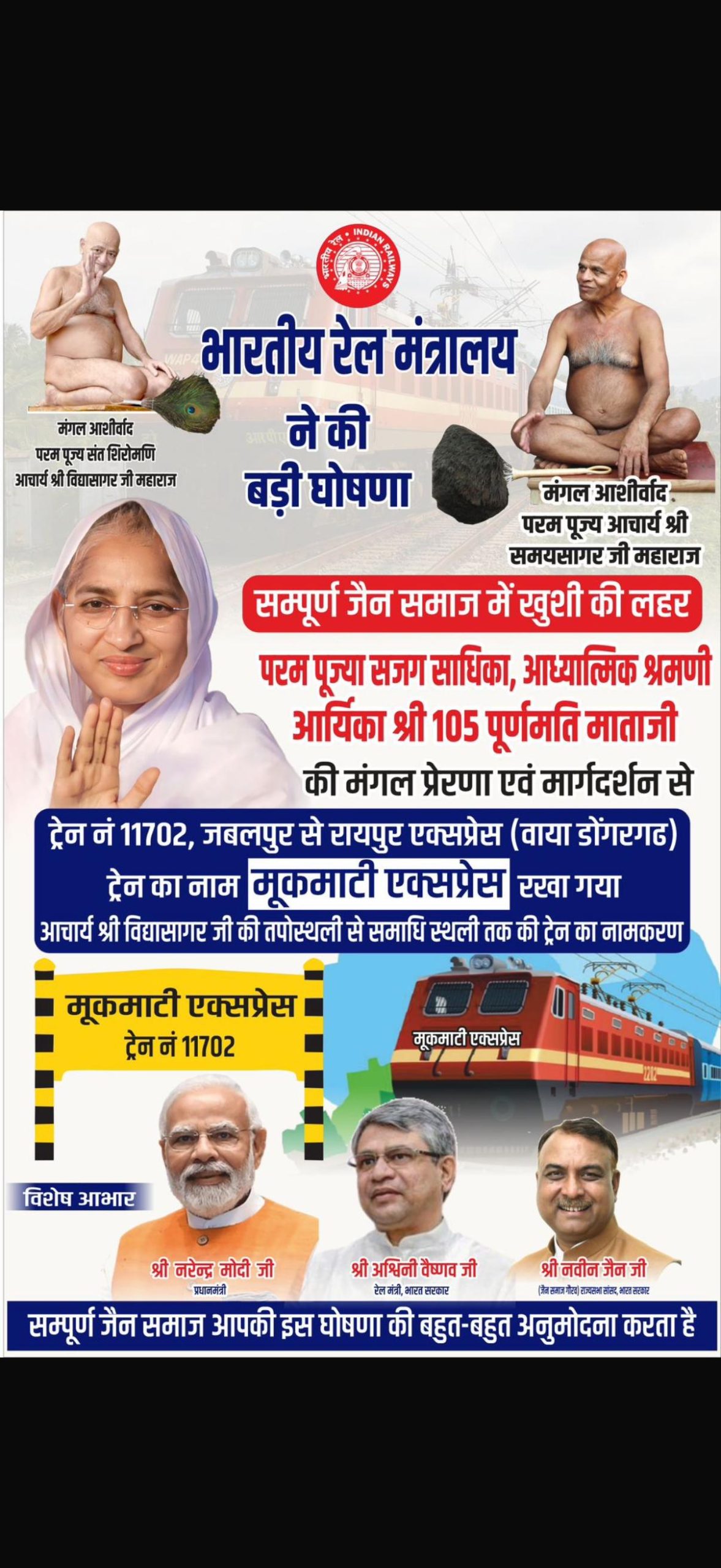 राज्यसभा सांसद नवीन जैन के मांगपत्र पर संज्ञान लेते हुए रेल मंत्रालय द्वारा आज 07 जनवरी 2026 को रेलगाड़ी संख्या-11702 जबलपुर रायपुर एक्सप्रेस (वाया डोंगरगढ़) का नाम “मूकमाटी एक्सप्रेस” रखे जाने की घोषणा की ।