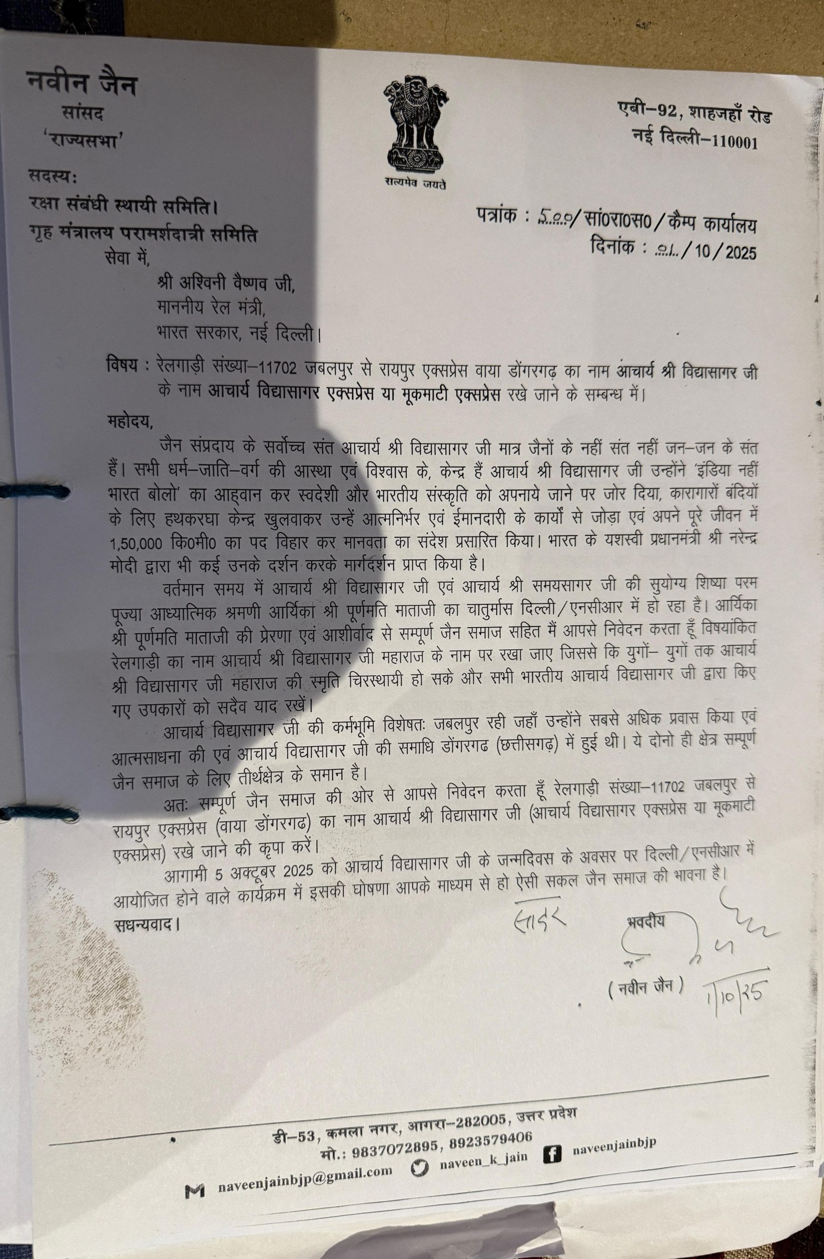 राज्यसभा सांसद नवीन जैन आगरा ने 01 अक्टूबर को अश्विनी वैष्णव जी, माननीय रेल मंत्री, भारत सरकार को एक मांग पत्र सौंपते हुए निवेदन किया कि जैन संप्रदाय के सर्वोच्च संत आचार्य श्री विद्यासागर जी मात्र जैनों के नहीं संत नहीं, जन-जन के संत हैं। सभी धर्म-जाति वर्ग की आस्था एवं विश्वास के केन्द्र हैं । आचार्य श्री विद्यासागर जी उन्होंने “इंडिया नहीं, भारत बोलो’ का आह्वान कर स्वदेशी और भारतीय संस्कृति को अपनाये जाने पर जोर दिया, कारागारों बंदियों के लिए हथकरघा केन्द्र खुलवाकर उन्हें आत्मनिर्भर एवं ईमानदारी के कार्यों से जोड़ा एवं अपने पूरे जीवन में 1,50,000 कि०मी० का पद विहार कर मानवता का संदेश प्रसारित किया। भारत के यशस्वी प्रधानमंत्री श्री नरेन्द्र मोदी द्वारा भी कई उनके दर्शन करके मार्गदर्शन प्राप्त किया है। वर्तमान में, आचार्य श्री विद्यासागर जी और आचार्य श्री समयसागर जी की सुयोग्य शिष्या परम पूज्य आध्यात्मिक श्रमणी श्री पूर्णमति माताजी का चातुर्मास दिल्ली/एनसीआर में चल रहा है। आर्यिका श्री पूर्णमति माताजी की प्रेरणा एवं आशीर्वाद से समस्त जैन समाज सहित आपसे मेरा अनुरोध है कि थीम वाली ट्रेन का नाम आचार्य श्री विद्यासागर जी महाराज के नाम पर रखा जाए ताकि आचार्य श्री विद्यासागर जी महाराज की स्मृति युगों-युगों तक बनी रहे।