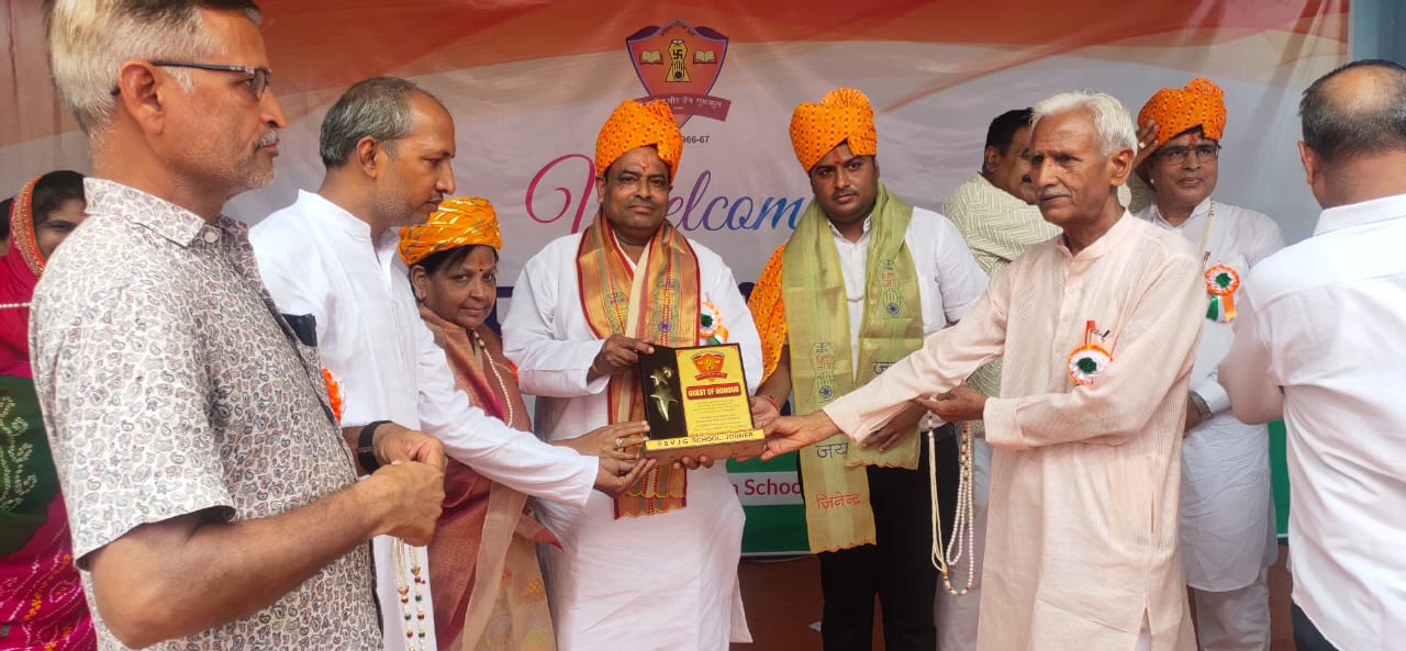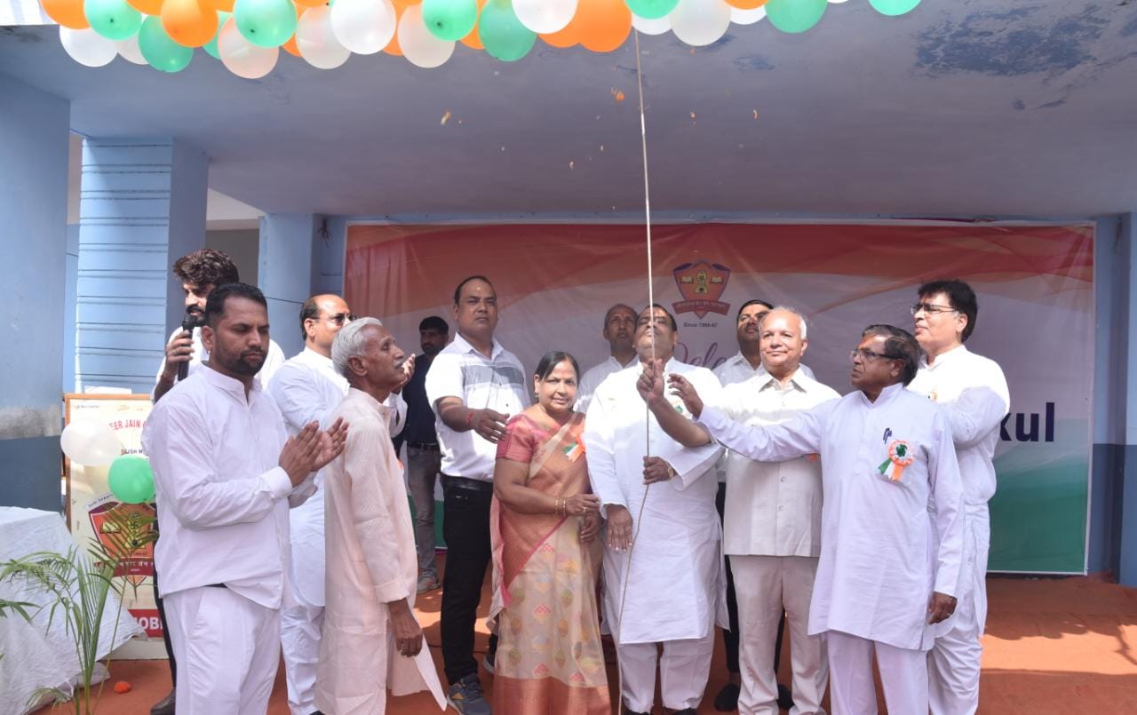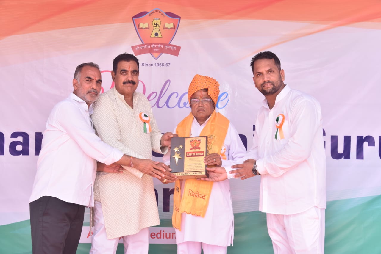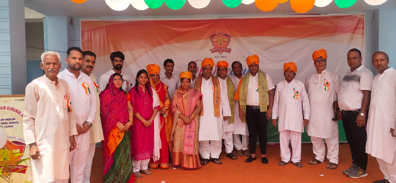 श्री शान्तिवीर जैन गुरुकुल स्कूल जोबनेर में 15 अगस्त 2023 को 77′ वां स्वंत्रता दिवस धूमधाम से मनाया गया। कार्यक्रम में मुख्य अतिथि श्री अनिलकुमार,नितिन कुमार, विपिनकुमार जैन बनेठा जयपुर वालों ने झंडारोहण कर कार्यक्रम का शुभारंभ किया, जैन महासभा के राजाबाबु गोधा ने कार्यक्रम में शिरकत करते हुए बताया कि इससे पूर्व पूर्वी जैन एवं ग्रुप द्वारा नवकार मंत्र की प्रस्तुतियां दी गई, कार्यक्रम में छोटे छोटे बच्चों द्वारा देशभक्ति से ओतप्रोत गानों पर डांस की प्रस्तुतियां दी गई, कक्षा पांच की बालिका ने इंग्लिश में स्वाधीनता दिवस पर शानदार स्पीच प्रस्तुत की कार्यक्रम में संस्था अध्यक्ष मदनलाल बड़जात्या,एवं कमेटी द्वारा सभी अतिथियों का तिलक, माला,साफा दुपट्टे से भव्य सम्मान किया गया एवं विधालय की गतिप्रगति एवं भावी योजनाओं के बारे में बताया, विधालय के संयोजक मिक्की बडजात्या ने अवगत कराया कि बाहर से पधारे अतिथियों में राजेश शाह, धर्मचंद लुहाडिया, संजय शाह, राकेश पाटनी, राजेन्द्र गोधा, ड्रा.प्रकाश सेठी, नरेश बड़जात्या,राजेश ठोलिया,आदि ने संस्था के विकाश एवं बच्चो की शिक्षा व्यवस्थाओं पर अपने अमूल्य सुझाव दिए एवं सहयोग प्रदान किया।संयोजक मिक्की बड़जात्या ने बताया कि इस वर्ष वृहद स्तर पर स्वतंत्रता दिवस मनाया गया जिसमें जोबनेर एवं जोबनेर के बाहर से भी अतिथियों को आमंत्रित किया गया था। कार्यक्रम में जोबनेर नगरपालिका अध्यक्ष मंजू सिंघी, व्यापार मंडल अध्यक्ष कल्याणमल कुमावत, नोरतन ओसवाल, सुरेंद्र सिंघी, गोविंद अग्रवाल,मोदीअग्रवाल, विजय बड़जात्या, मुकेश ठोलिया, महेश बड़जात्या, सुमेर ठोलियां, नीलेश बड़जात्या, सुनीता पाटनी, हिंगोनिया से प्रकाश रावकां फुलेरा से नितेश रावकां, अध्यक्ष मदनलाल जैन, मंत्री महेंद्र गंगवाल, उपाध्यक्ष रमेश बड़जात्या, उप मंत्री अमित छाबड़ा, कोषाध्यक्ष मनीष सेठी, विनोद बड़जात्या, प्रधानाचार्य हिमांशु भातरा,तथा फागी से राजाबाबु गोधा आदि की विशेष उपस्थिति रही। कार्यक्रम का कुशल संचालन संस्था के प्रिंसिपल हिमांशु भारद्वाज एवं पूजा सोनी मेडम द्वारा किया गया कार्यक्रम में बच्चो, अभिभावकों एवं ग्राम वासियों की विशेष उपस्थिति रही एवं लगभग 3 घण्टे कार्यक्रम में सभी की उपस्थिति रही। कार्यक्रम पश्चात वासल्य भोजन एवं बच्चो को मिठाई वितरण डॉ प्रकाश सेठी ,अनिल सेठी परिवार द्वारा किया गया। कार्यक्रम में श्री अनिल कुमार जी पांड्या एवं राजाबाबु गोधा ने भी आजादी के अमृत महोत्सव पर देश भक्ति के बारे में बच्चों को सम्बोधित किया।उक्त कार्यक्रम में प्रसिद्ध समाजसेवी,भामाशाह श्री अनिल कुमार जी पांड्या बनेठा को वालों को शान्तिवीर जैन गुरुकुल विधालय का संरक्षक बन