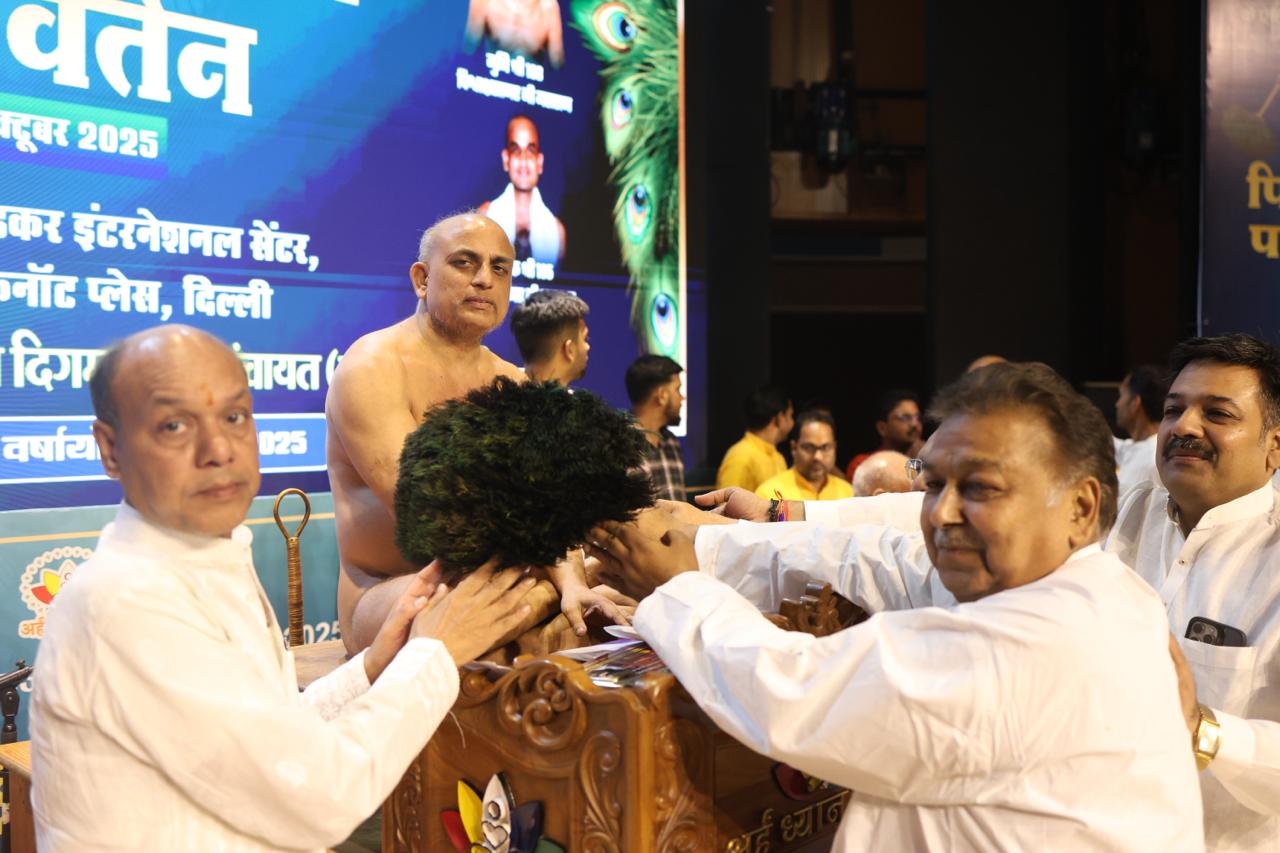 नई दिल्लीः प्राचीन श्री अग्रवाल दिगंबर जैन पंचायत के तत्वावधान में डा. अम्बेडकर इंटरनेशनल सेंटर जनपथ में रविवार को आयोजित भव्य समारोह में लाल मंदिर में चातुर्मास करने वाले अर्हम योग प्रणेता मुनि श्री प्रणम्य सागरजी महाराज ससंघ का पिच्छी परिवर्तन और चातुर्मास निष्ठापन भव्यता से संपन्न हुआ। मुनि श्री ने चातुर्मास के महत्व पर प्रकाश डाला। जैन समाज दिल्ली के अध्यक्ष चक्रेश जैन ने मुनि श्री को विनयांजलि अर्पित की और सभी अतिथियों का स्वागत किया