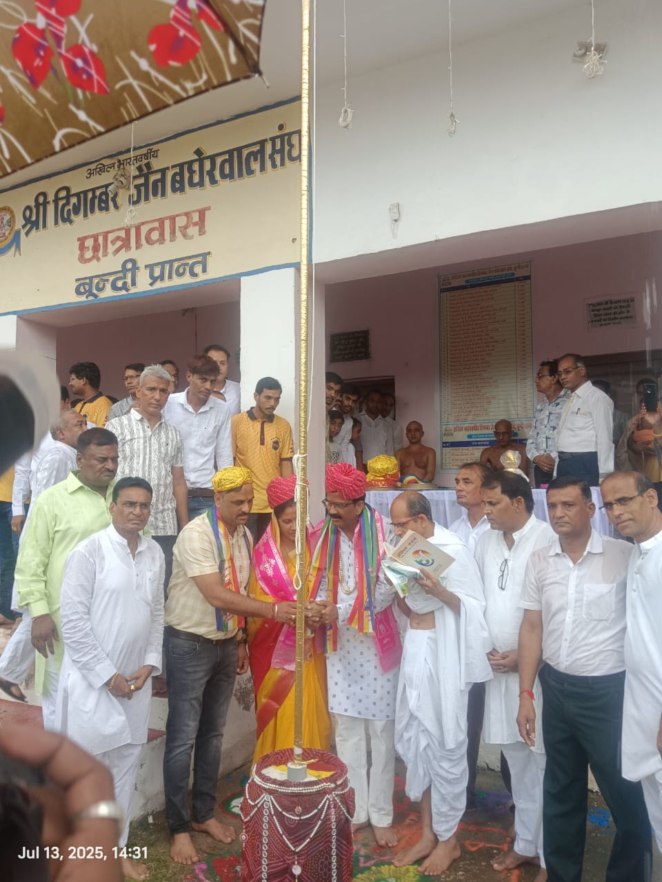 बूंदी, 14 जुलाई। शहर के देवपुरा में स्थित बघेरवाल छात्रावास में रविवार को परम पूज्य मुनि वैराग्य सागर महाराज व मुनि सुप्रभ सागर महाराज का वर्ष 2025 का वर्षायोग का मंगल कलश स्थापना समारोह हुआ। इस अवसर पर आर्यिका सत्यमति माताजी व हेमश्री माताजी भी उपस्थित रही। उपस्थित भक्तों ने ढोल नगाड़ों के साथ दोनों मुनिराजों को देवपुरा में स्थित संतशाला से जुलूस के रूप में बघेरवाल छात्रावास पहुंचे जहां पर ध्वजारोहण का कार्यक्रम हुआ। ध्वजारोहण कर्ता महेन्द्र कुमार, सीमा व मनीष हरसौरा थे। उसके पश्चात मंगलाचरण वीर शासन महिला मंडल की महिलाओं ने किया। चित्र अनावरण महेन्द्र, सीमा हरसौरा, महावीर धनोप्या, प्रदीप हरसौरा ने किया। दीप प्रज्वलन विनोद कुमार रिषभ कुमार ने किया।