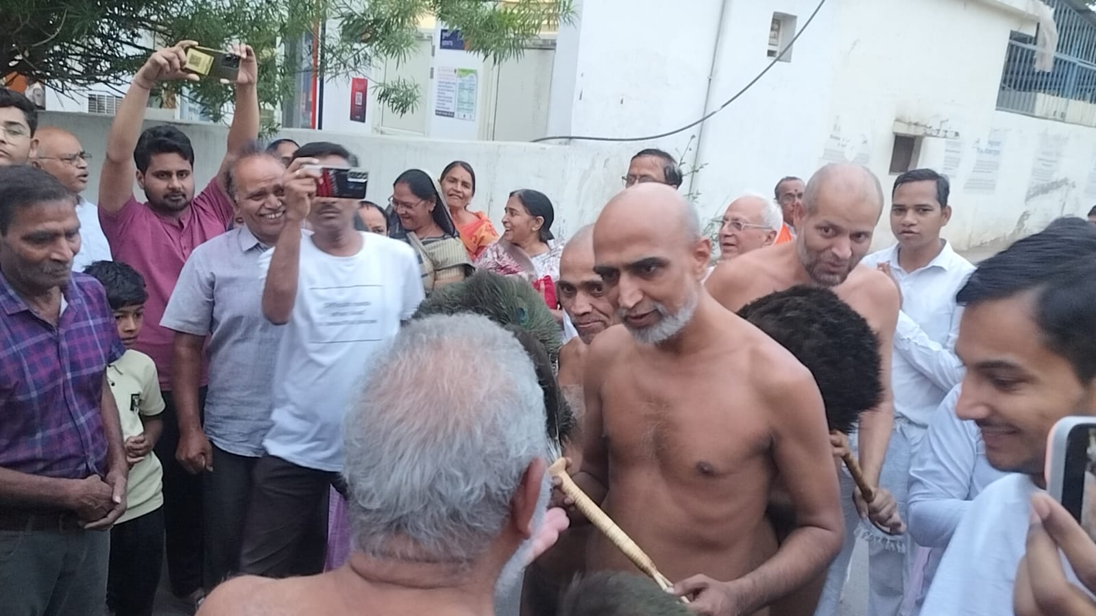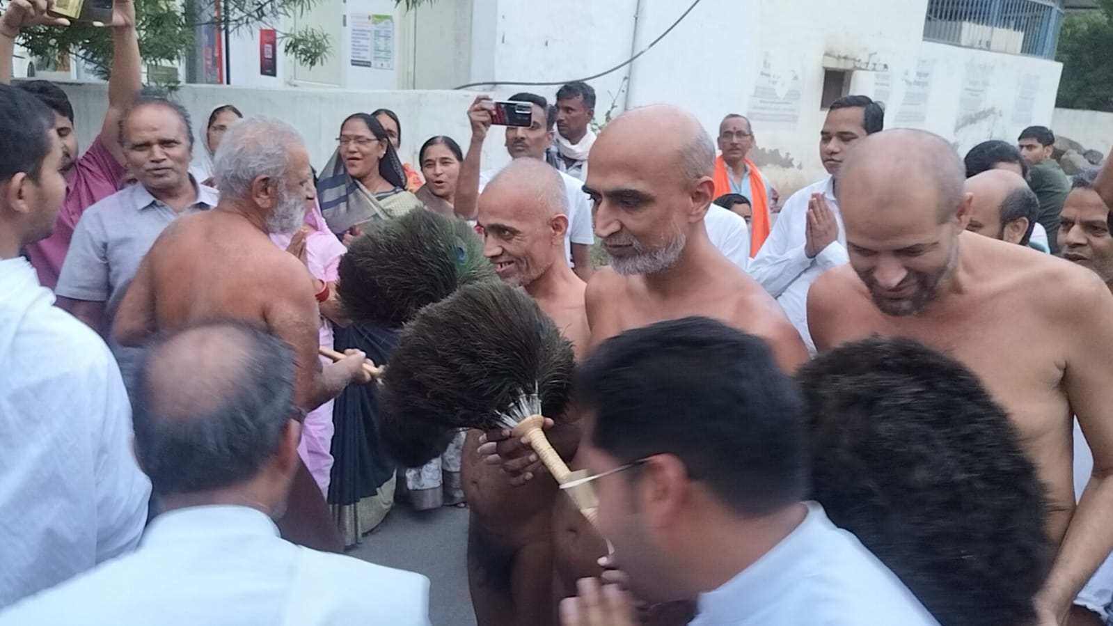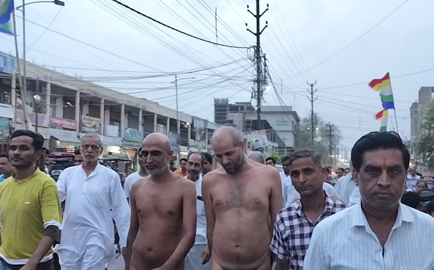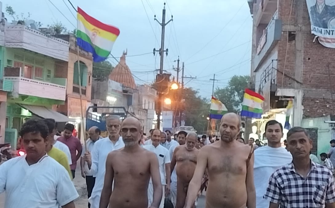 श्री दिगम्बर जैन संतों को गाजे बाजे के साथ भव्य शोभा यात्रा के रूप में नगर भ्रमण कराते हुए बड़े जैन मंदिर में भव्य प्रवेश कराया गया । शोभा यात्रा में सभी बंधु पचरंगी ध्वजा लेकर जैन धर्म के सिद्धांतों पर आधारित जयघोष करते हुए चल रहे थे ।