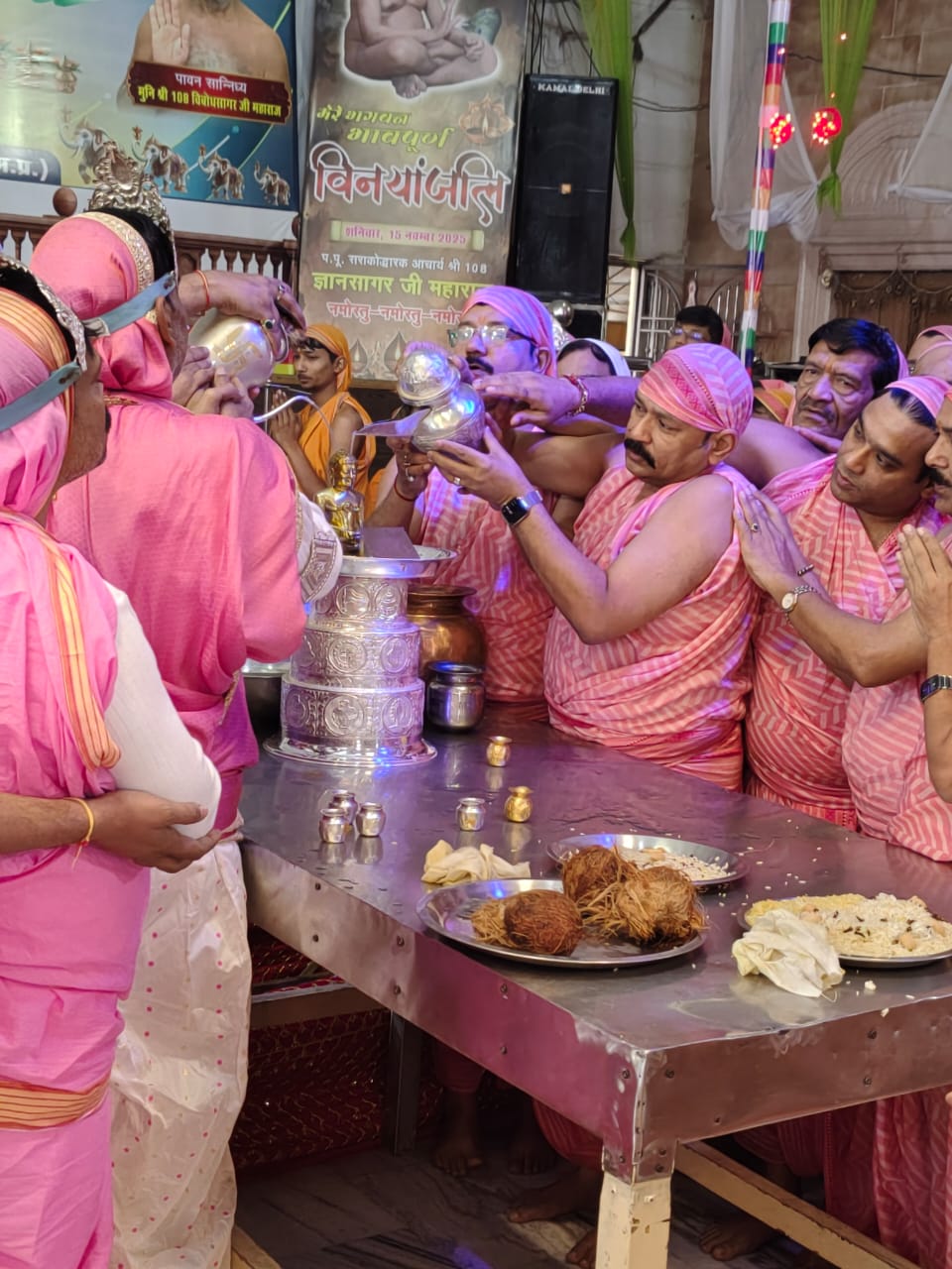 प्रातः से ही जैन मंदिर जयकारों से गुंजायमान हो रहा था। हल्के गुलाबी रंग के धोती दुपट्टे एवं माला-मुकुट से सुसज्जित, उत्साह से भरपूर युवाओं द्वारा पाण्डुक शिला पर विराजमान श्री जिनेन्द्र प्रभु की प्रतिमा का महामस्तकाभिषेक किया । यह दृश्य भक्तिमय वातावरण में एक भव्य आयोजन सम प्रतीत हो रहा था। पूज्य मुनिश्री विबोधसागर महाराज के मुखारविंद से मंत्रोच्चारण के साथ शांतिधारा हुई।