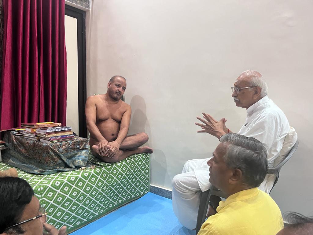 जयपुर राजधानी के दक्षिण भाग स्थित प्रताप नगर के सेक्टर 8 शांतिनाथ दिगंबर जैन मंदिर परिसर में 29 वर्षों में पहली बार चातुर्मास कर रहे दिगंबर जैनाचार्य, जीवन आशा हॉस्पिटल प्रेरणा स्त्रोत आचार्य 108 श्री सौरभ सागर महाराज के दर्शनार्थ,1 अगस्त 2023 को राष्ट्रीय स्वयं सेवक संघ के अंतर्राष्ट्रीय संरक्षक, विश्व हिंदू परिषद के मार्गदर्शक एवं श्री राम जन्मभूमि तीर्थ क्षेत्र व्यास के मुख्य आमंत्रित सदस्य दिनेश चंद्र, विश्व हिंदू परिषद् केंद्रीय सहमंत्री हरिशंकर, जयपुर प्रांत संगठन मंत्री राधेश्याम एवं जयपुर प्रांत सहमंत्री विवेक दिवाकर सहित विभिन्न पदाधिकारी गण पधारे और लगभग डेढ़ – दो घंटे तक आचार्य श्री से वार्तालाप कर मार्गदर्शन व आशीर्वाद प्राप्त किया। इस दौरान श्री पुष्प वर्षायोग समिति के गौरवाध्यक्ष राजीव जैन गाजियाबाद वाले, महामंत्री महेंद्र जैन पचाला, कार्याध्यक्ष दुर्गालाल जैन नेताजी, मुख्य समन्वयक गजेंद्र बड़जात्या, महावीर गोयल, प्रमोद जैन बावड़ी वाले, प्रचार संयोजक सुनील साखुनिया एवं चेतन जैन निमोडिया, बाबूलाल जैन इटुंदा, नरेंद्र जैन आवा वाले आदि सहित विभिन्न पदाधिकारियों ने सभी अतिथियों का तिलक लगाकर, साफा, दुपट्टा, माला पहनाकर स्वागत – सम्मान किया।इससे पूर्व कार्यक्रम में प्रातः 8.30 बजे प्रताप नगर जैन मंदिर के संत भवन में आचार्य सौरभ सागर महाराज ने नशे पर प्रकाश डालते हुए भरी धर्मसभा को संबोधित करते हुए कहा कि – ” नशा, नाश, विनाश जीवन में यह एक दूसरे के पूरक है, जिसने नशे को धारण कर लिया उसका नाश और विनाश निश्चित है, यह वो मीठा जहर है जो शुरू में तो मीठा लगता है मुंह पर चिपक जाता है किंतु जब जिसकी मिठास डाईबीटीज की तरह अपने पांव पसारने लगती है तो जहर बन जाती है और नशे को धारण करने वाले प्राणी का ना केवल नाश कर देती है बल्कि उस प्राणी का विनाश तक कर देती है। जिसके कारण अच्छे से अच्छे और बड़े से बड़े परिवार तबाह हो जाते है। अगर इंसान को नशा करना है तो ईश्वर की आराधना का करे, जरूरतमंद लोगों की मदद करने का करें, इंसानियत दिखाने का करे किंतु कभी शराब जैसी वस्तुओं का नशा ना करें।